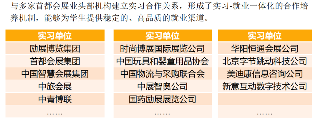 我校会展专业充分利用北京国际会议、专业展览、大型节事活动的主承办机构急需会展专业人才的契机,与多家首都会展业头部机构建立实习合作关系,形成了校内实践-校外实习-毕业就业一体化的合作培养机制,能够为学生提供稳定的、高品质的就业渠道。