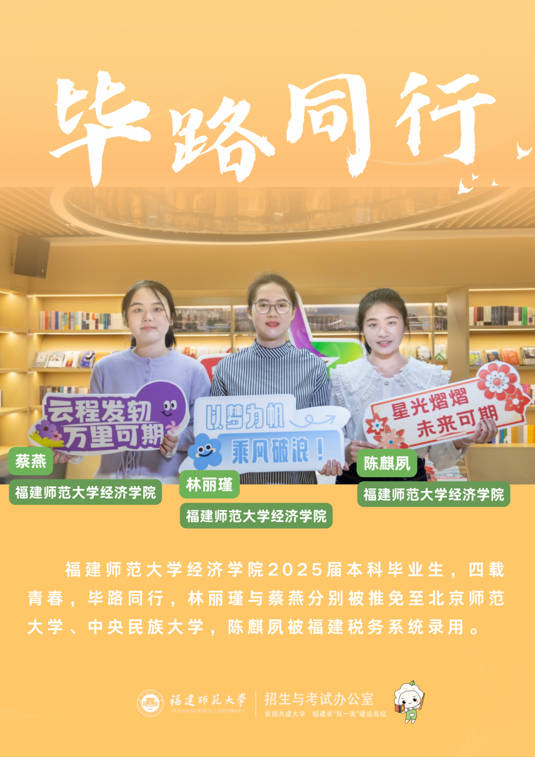 最是钟楼侧边柳,千枝蘸绿写新篇。福建师范大学招生与考试办公室继2024年推出《离歌声声》系列毕业生采访后,联动学生工作部再次推出《毕路同行》专栏,聚焦2025届本科毕业生从入学、成长、毕业、就业的青春叙事,让我们一起聆听青春破茧的声音,见证师大沃土孕育的繁花如何绽放于更广阔的天地吧!
