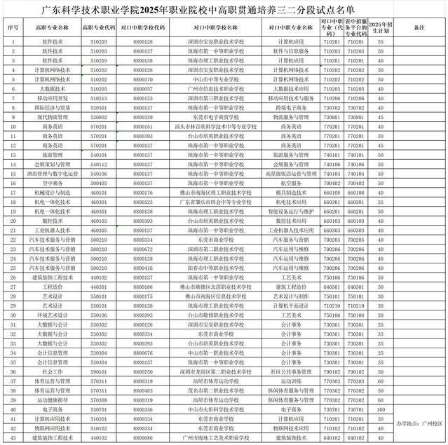 根据广东省教育厅广东省招生会员会办公室《关于开展2025年职业院校中高职贯通培养三二分段试点工作的通知》(粤教职函〔2025〕15号)文件精神,现将我校2025年中高职贯通培养三二分段试点名单公布如下: