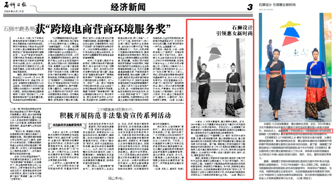 服装与艺术设计学院学科专业布局正是应区域产业社会发展而生,自创办以来就重视社会服务,并通过社会服务培养应用型人才。多年来,形成了服务品牌企业生产经营专项活动、服务海博会地方行业重大活动等特色。一方面,21级、23级服装专业学生先后服务利郎、爱登堡等品牌企业订货会活动。另一方面,2024年6月惠女文化节暨惠安诗会名家名刊惠安行采风活动在福建省泉州市惠安县小岞美术馆启动,学校创意设计及鞋服制造创新团队设计的系列创新惠女服饰入选启动仪式发布活动;2024年9月福建省第十七个民族团结进步宣传月启动仪式在石狮开幕,闽理服装走秀《华裳九州》节目入选开幕式活动;闽理设计服务了地方重要文化活动。