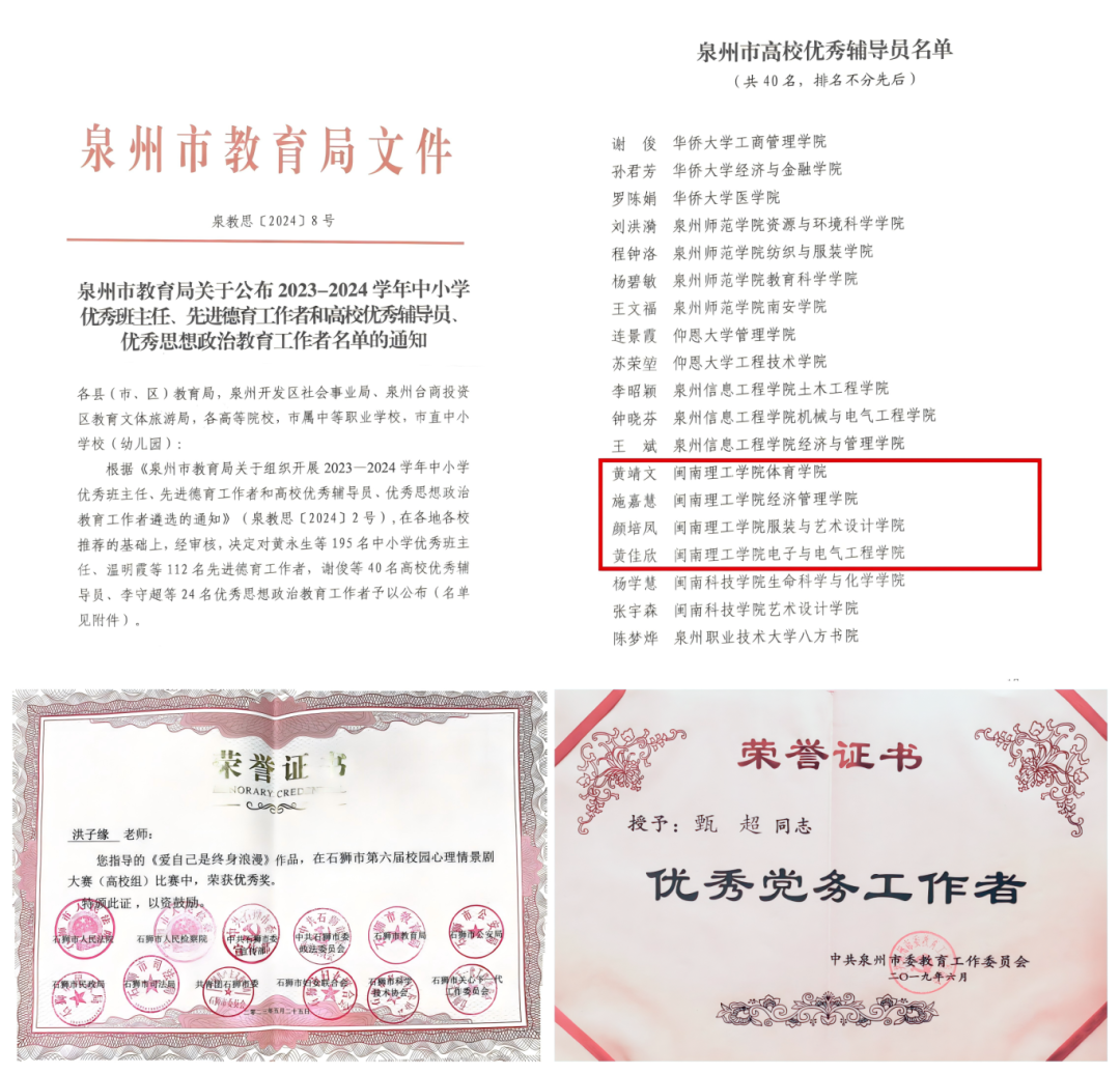 学院师资保障有力,现有专任教师122人、行业企业兼职教师近50人,其中博导1人、硕导4人,福建省高校杰青1人,服装工程省级本科教学团队1个,泉州市学科带头人1人,泉州市技能大师1人。师资团队注重双师双能建设,目前学院双师双能型教师整体占比超40%,在中国高等教育学会、中国美术家协会、中国服装设计师协会、中国纺织服装教育协会、中国纺织工程学会等行业协会学会任职10余人次,其中获评全国制鞋行业技术能手1人、福建省十佳服装设计师2人、石狮市十佳服装设计师1人,入选“港湾计划”泉州市高层次人才10余人。重视思政类辅导员队伍建设。辅导员队伍结构合理,专业素质过硬,其中获评泉州市高校优秀辅导员1人、泉州市优秀党务干部1人、泉州市五四红旗团干部1人。