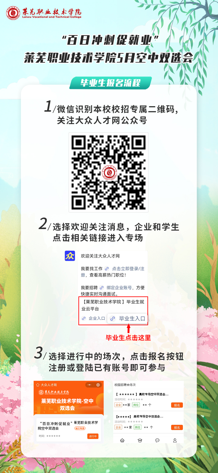 手机微信扫码关注“大众人才网”微信公众号,企业和毕业生分别点击相关按钮进入莱芜职业技术学院校招端口,点击报名按钮,注册或登录已有账号即可直接参与。