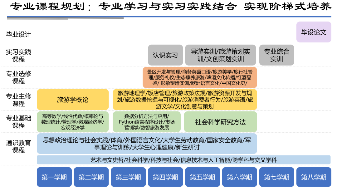 管理学、宏观经济学、微观经济学、市场营销学、旅游学概论、饭店管理、旅游政策与法规、旅游资源开发规划、旅游地理学、文化创意与策划、数智旅游发展、旅游消费者行为、旅游英语、服务礼仪、旅游数据挖掘可视化、数据分析方法与应用、社会科学研究方法、Python语言程序设计等。