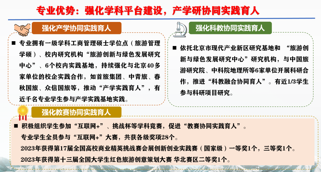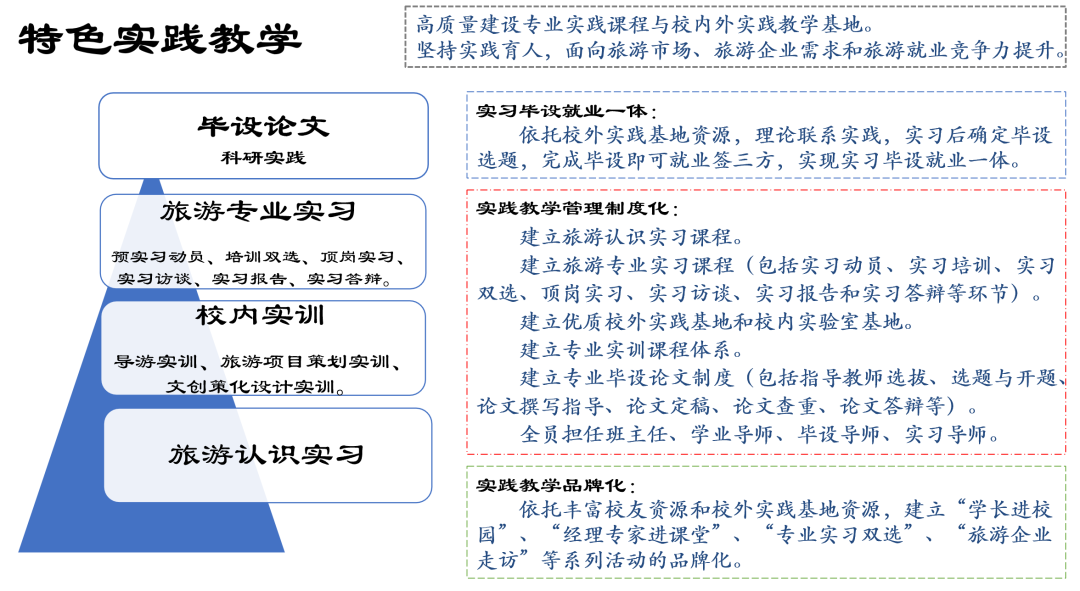 专业注重能力培养,实践育人,本硕一体化培养,培养“文旅服务策划、数智旅游运营”高水平应用型人才。
