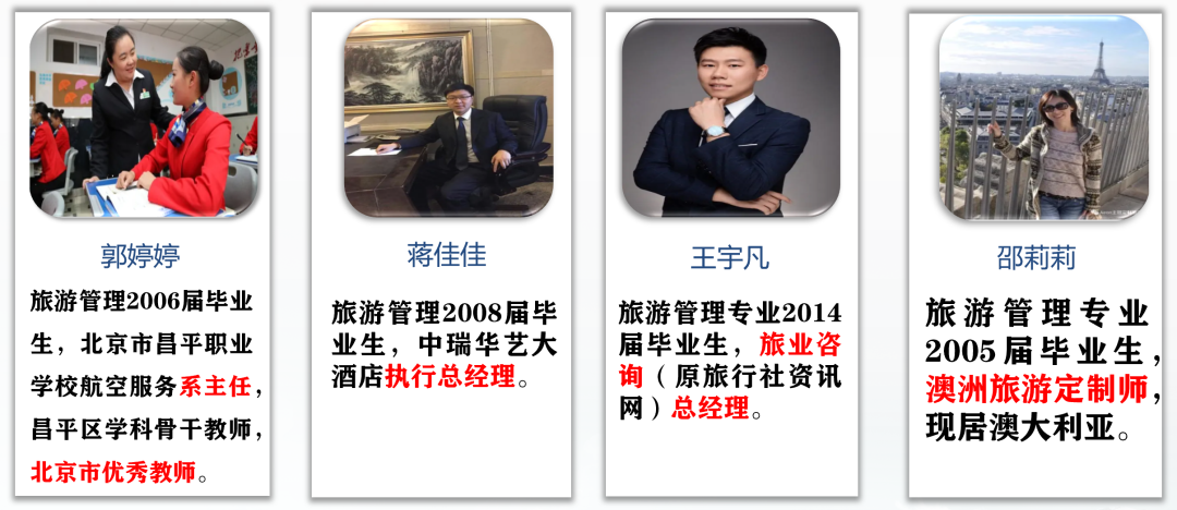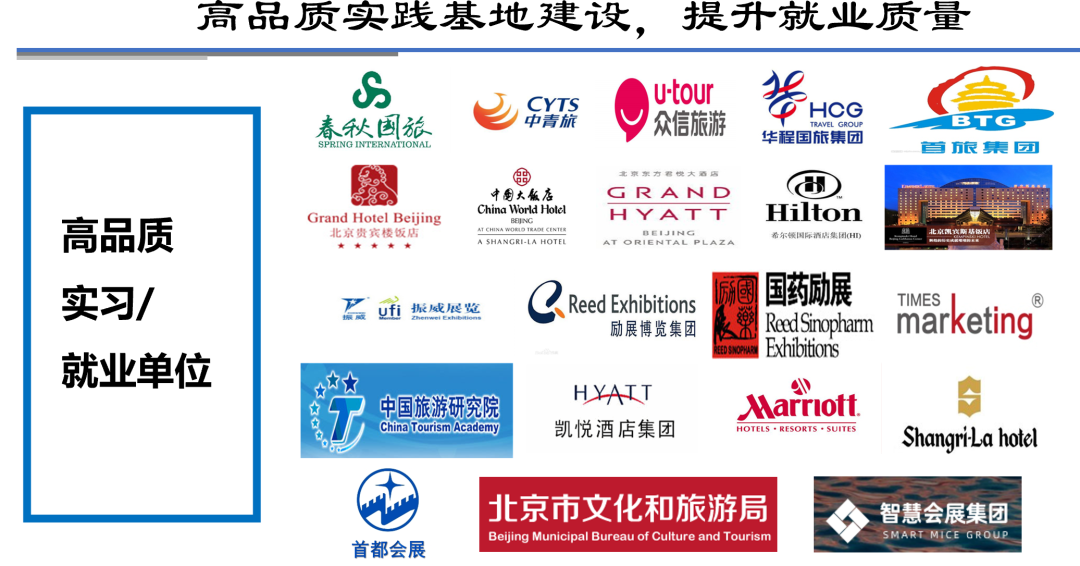 主要就业企事业单位有:有北京各级文旅局、首旅集团、众信国旅、春秋国旅、中青旅集团、华程国旅、中智商展集团、贵宾楼饭店等;有颐和园、圆明园、凤凰岭和玉渊潭等景区公园;有故宫博物院、中国园林博物馆和中国工业美术馆等;有北京求实职业学校、北京昌平职业学校、京北职业技术学院和北京新媒体技师学院等院校。