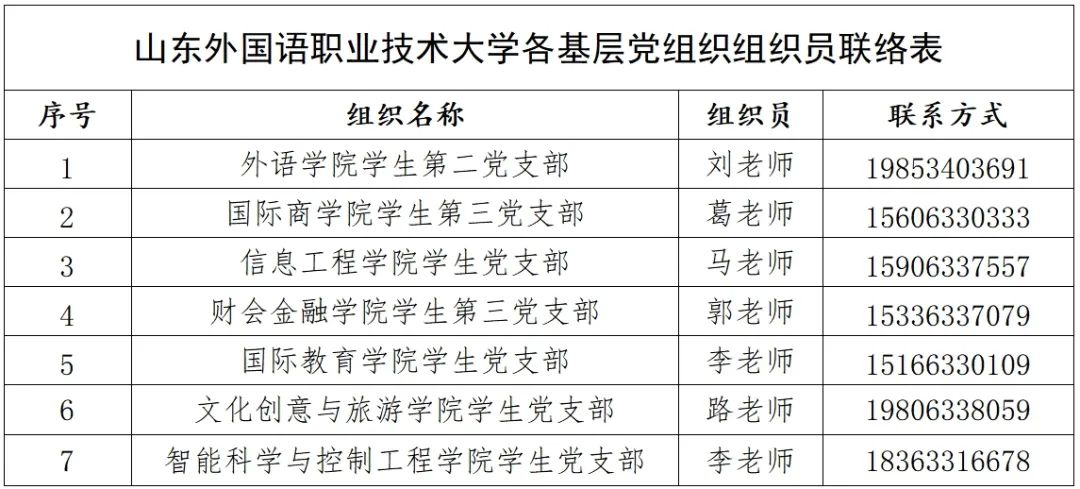 3. 灯塔系统内已进行转接的人员,入学后需要将本人党员档案交给所在党支部组织员,详见《山东外国语职业技术大学各基层党组织组织员联络表》。