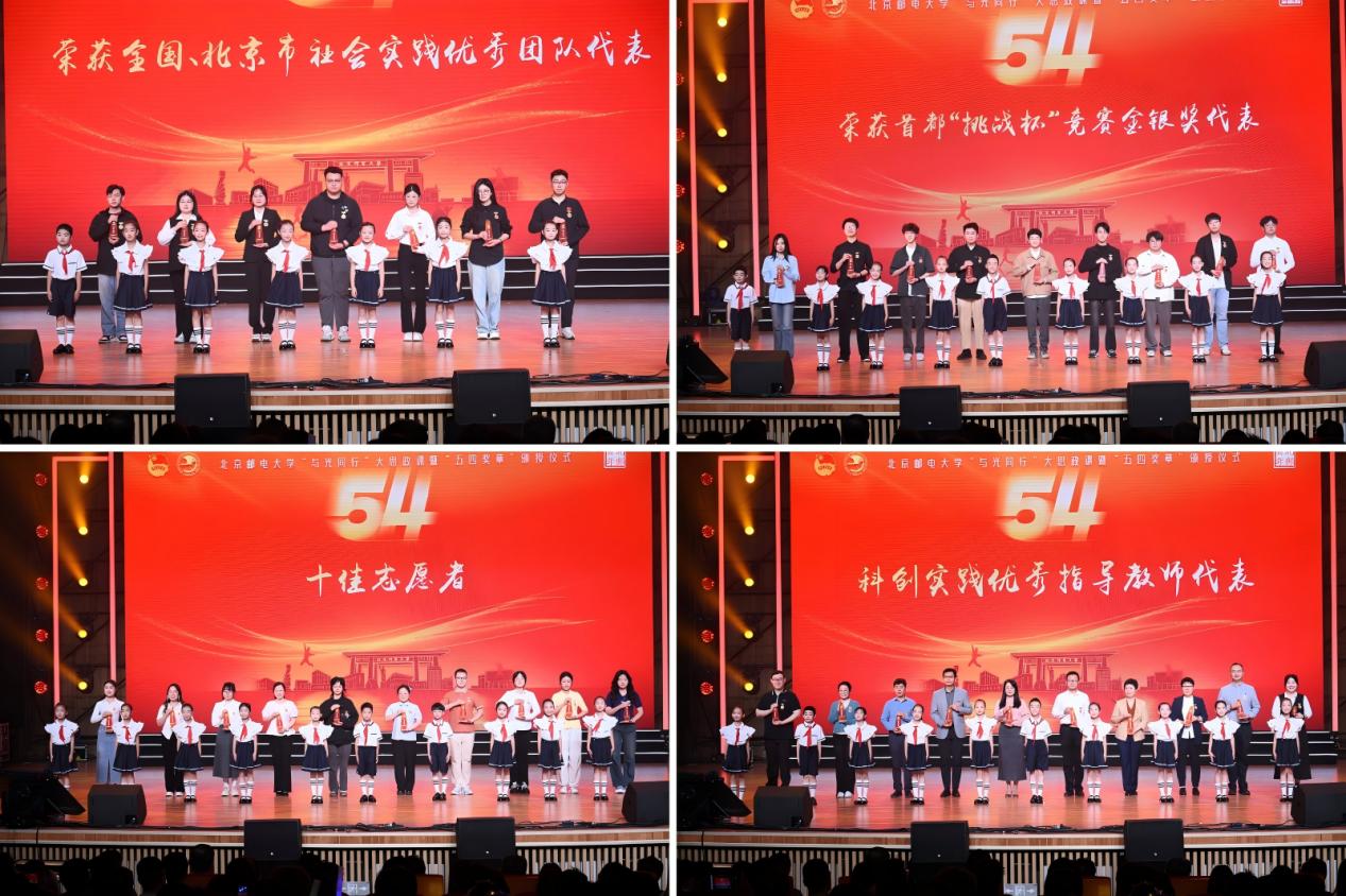 北邮附小少先队员代表向社会实践优秀团队代表、双创竞赛优秀个人代表、学校十佳志愿者、科创实践优秀指导教师代表等北邮青年榜样致敬。
