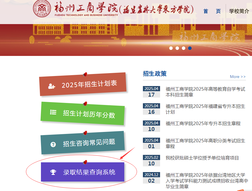 登录福州工商学院招生信息网(https://zhaosheng.fzgsxy.edu.cn/)点击“录取结果查询系统”。