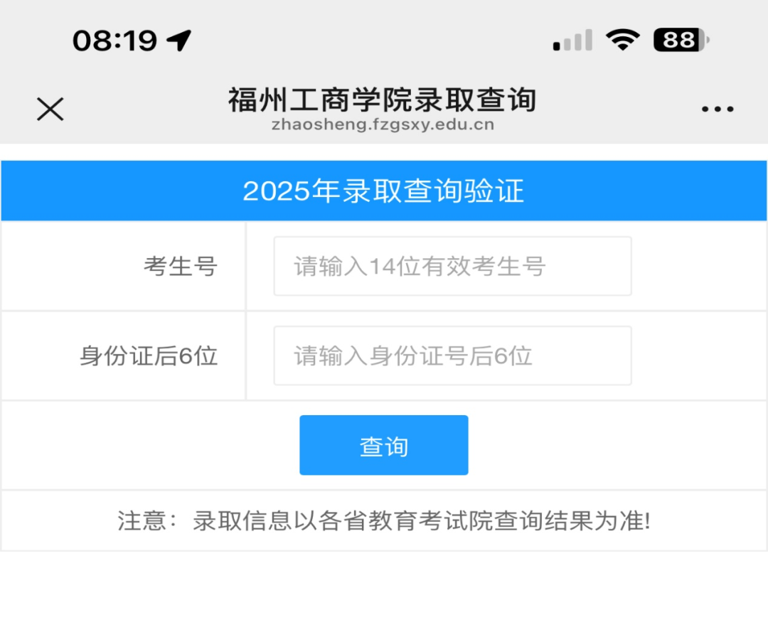 输入14位考生号及身份证后6位,查询相关录取信息。