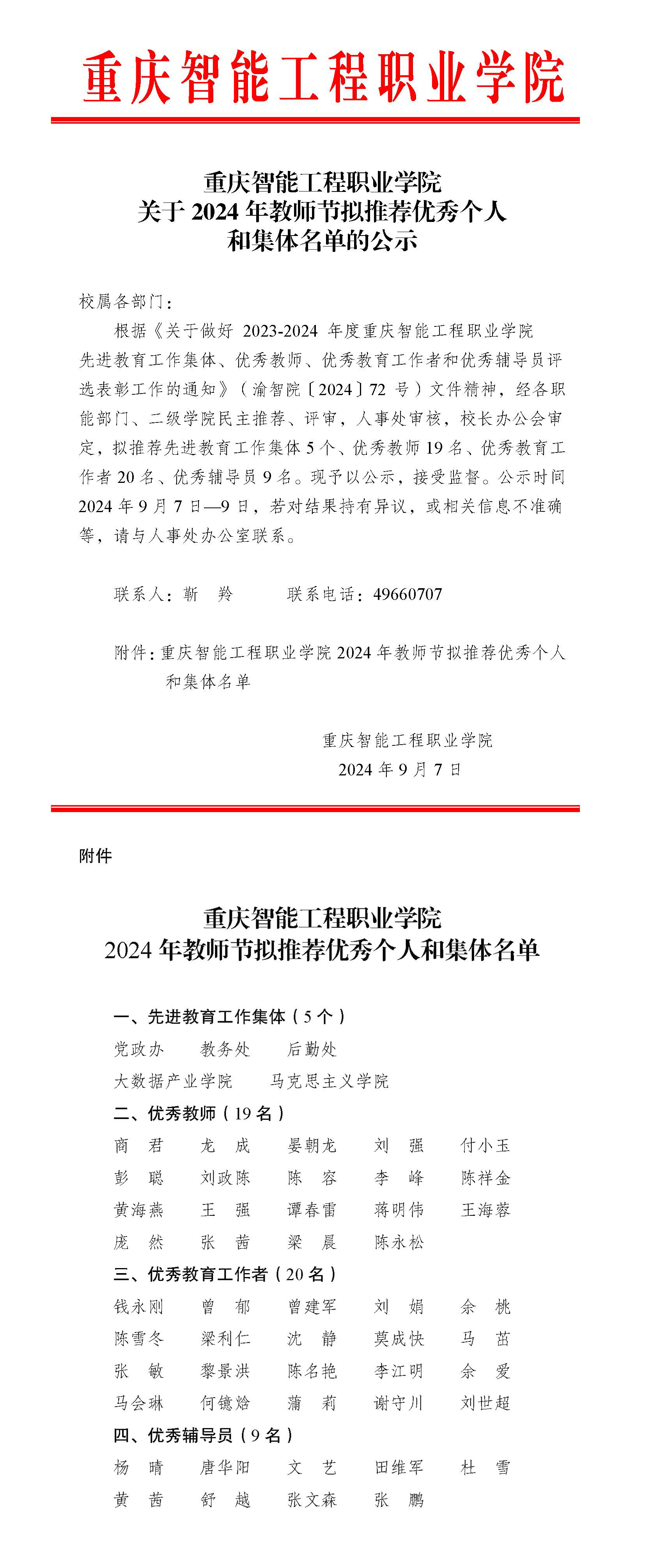 关于2024年教师节拟推荐优秀个人和集体名单的公示