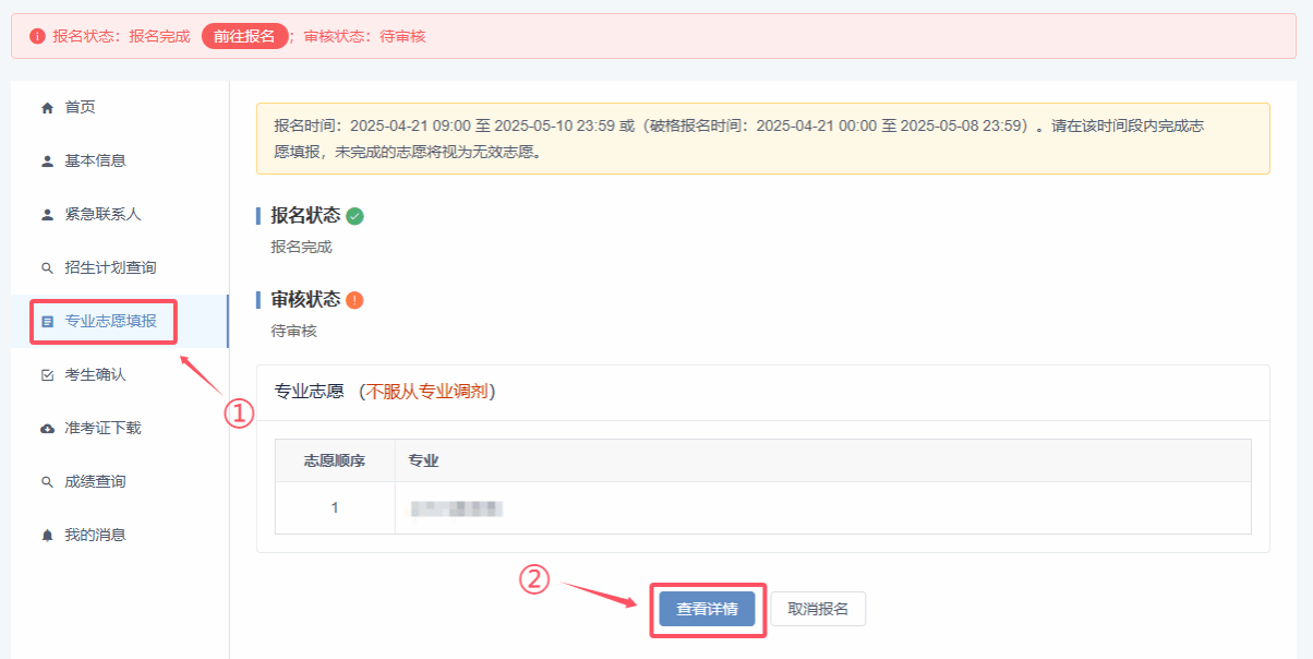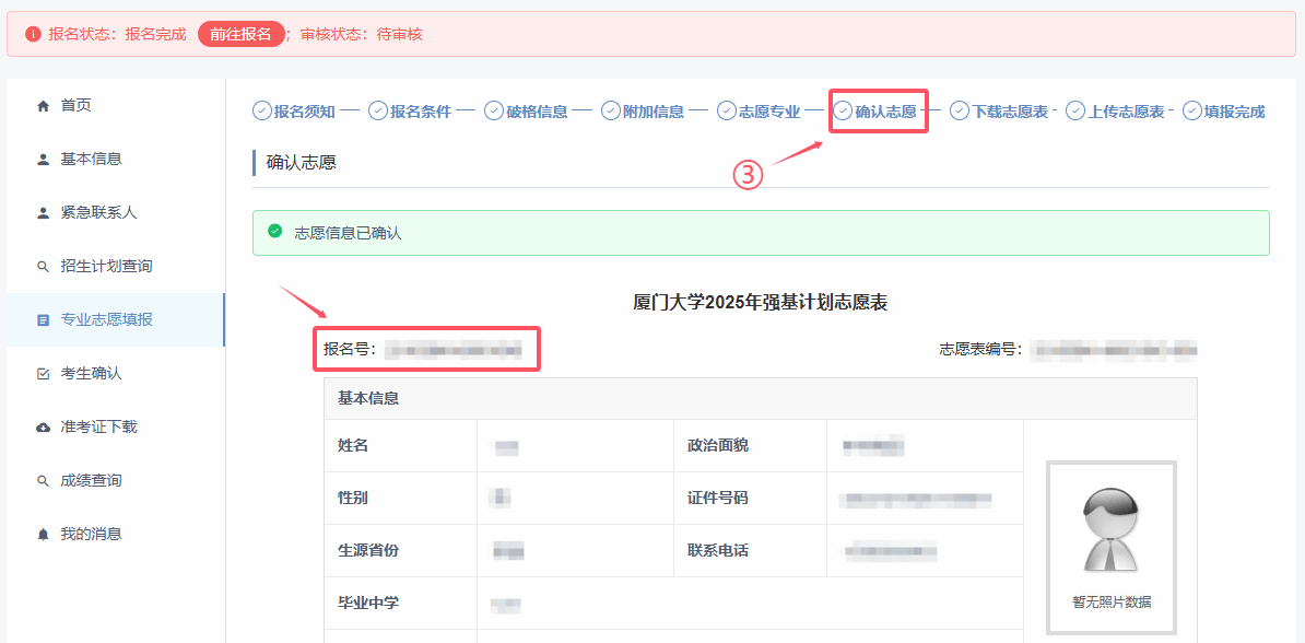 强基计划报名号查询方式:登录强基计划报名平台,左边菜单栏点击“专业志愿填报”,查看报名详情,在确认志愿环节的强基计划志愿表上查看报名号。