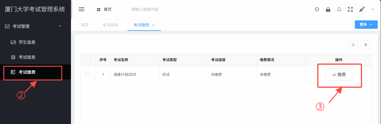 2.考生凭强基计划报名号和身份证号登录我校考试管理系统(网址:https://bmjf.xmu.edu.cn/)进行缴费。缴费时间:5月12日9时至5月16日24时,逾期系统将关闭。网上缴费操作指南详见附件。