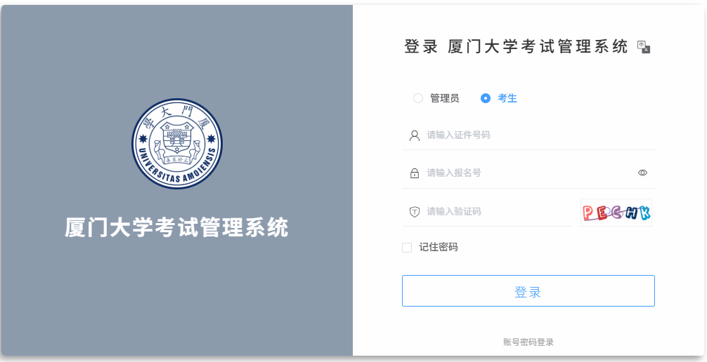 第二步:在电脑浏览器访问考试管理系统(网址:https://bmjf.xmu.edu.cn。网上缴费须用电脑操作,不支持手机操作),输入强基计划报名号、身份证号,填写验证码后点击登录按钮进入系统。