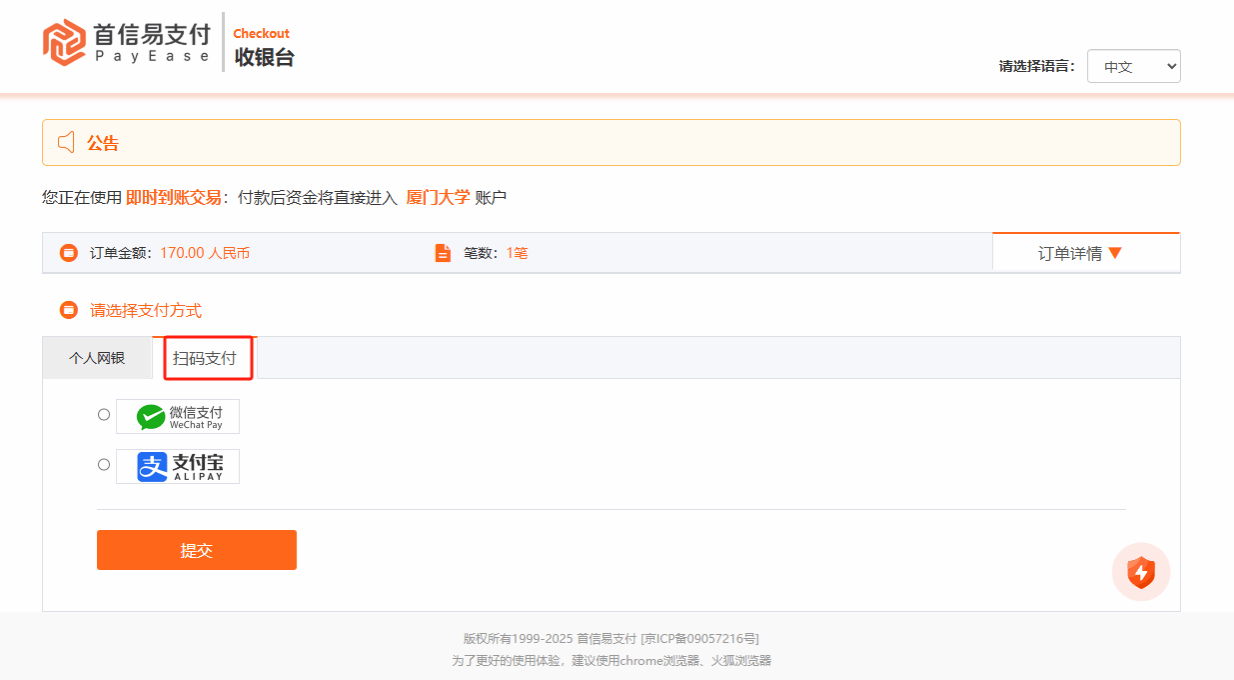 第四步:在弹出的页面点击扫码支付,使用微信或支付宝扫码进行支付。