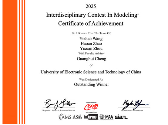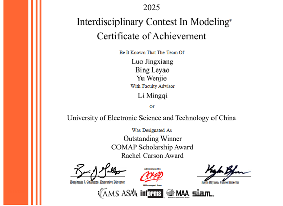 大学生数学建模竞赛是目前电子科技大学学生参与人数最多、涉及专业最广的学科竞赛活动之一,对培养大学生实践创新能力具有重要意义。在学校教务处和数学科学学院的大力支持下,电子科技大学数学建模创新中心不断完善竞赛培训工作,并以竞赛为牵引,实现竞赛课程化,形成了一套“课程-培训-实践”系统高效的训练体系。目前,数学建模创新中心面向全校开设的课程有通识课“数学与创造力”、“漫话数学建模”、“数学建模”,素质教育选修课“数学建模基础”、“数学建模方法”、“数学建模实验”等不同层次的课程体系,每年受益学生超过2000人,为参赛同学提供了有力支撑。此次成绩的取得,体现了我校在数学建模教育领域的深厚积淀与创新能力。未来,数学建模创新中心将继续以赛促学、以赛促研,助力更多我校学子在国际舞台上展现成电风采!