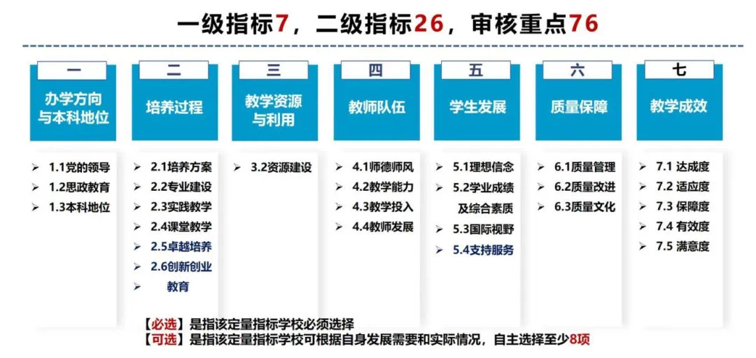 3.审核重点中定量指标的具体要求可参考国家相关标准。其中,【必选】是指该定量指标学校必须选择;【可选】是指该定量指标学校可根据自身发展需要和实际情况自主选择至少8项。
