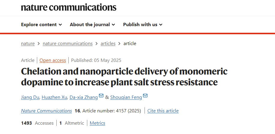 近日,国际知名学术期刊《自然—通讯》在线发表了山东农业大学园艺科学与工程学院冯守千课题组和植物保护学院张大侠课题组的最新研究成果。研究成功解决了多巴胺在使用过程中容易自聚合及土壤中吸附损耗大的难题,有效提升了多巴胺缓解植物盐胁迫的效果,为盐渍化农田的作物增产提供了可行方案,为应对全球粮食安全挑战提供了新的工具。