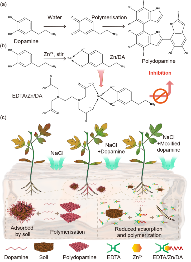 课题组将多巴胺与乙二胺四乙酸和锌离子进行螯合,形成螯合态多巴胺,并研发一种木质素基纳米载体将其负载,构建出纳米递送体系。论文通讯作者张大侠副教授说:“经检验,与单体多巴胺相比,纳米体系使多巴胺的土壤吸附率降低了46.02%。此方法不仅有效缓解了多巴胺的自聚,还显著减少了其在土壤中的吸附损耗,提升了多巴胺缓解植物盐胁迫的能力。”
