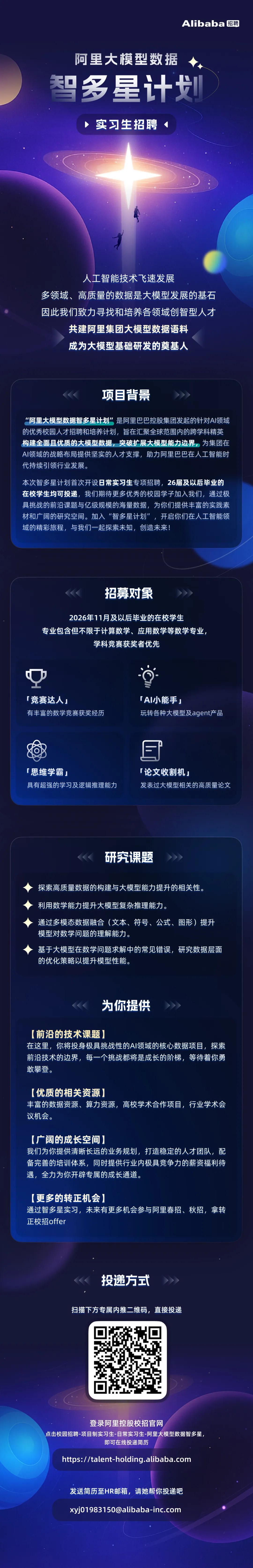 阿里集团招聘官网(点击查询各家社招&校招信息)阿里巴巴控股集团|阿里云|淘天集团|本地生活集团-饿了么|本地生活集团-高德|阿里国际数字商业集团|菜鸟集团|阿里大文娱集团|阿里健康|斑马智行|橙狮体育|钉钉|达摩院|飞猪|盒马|灵犀互娱|平头哥丨通义实验室丨亚博科技|智能互联|智能信息|阿里集团春季2026届实习生招聘(点击了解各家25届实习生招聘详情)阿里巴巴控股集团|阿里云丨淘天集团|本地生活集团-饿了么丨本地生活集团-高德|阿里国际数字商业集团丨菜鸟集团丨阿里大文娱集团丨通义实验室|斑马智行丨钉钉丨飞猪丨盒马丨灵犀互娱丨平头哥丨智能信息欢迎继续关注↓了解更多阿里集团招聘信息