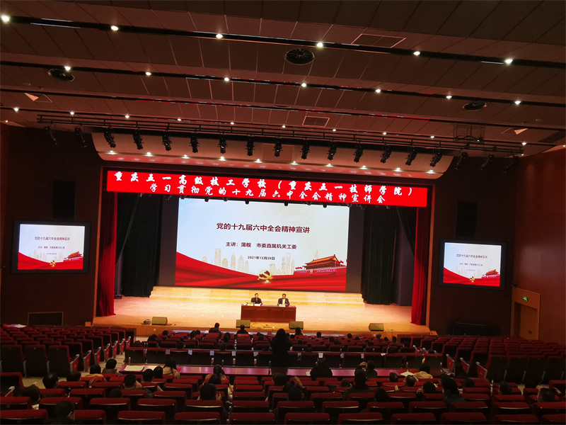 2021年12月28日,我校特邀学习贯彻党的十九届六中全会精神宣讲队成员、市委直属机关工委一级巡视员蒲舰同志,来校进行党的十九届六中全会精神专题宣讲。会议由校党委副书记、副校长张鹏同志主持,学校党员代表、青年理论学习小组成员代表、公共实训中心代表等96人参加会议。