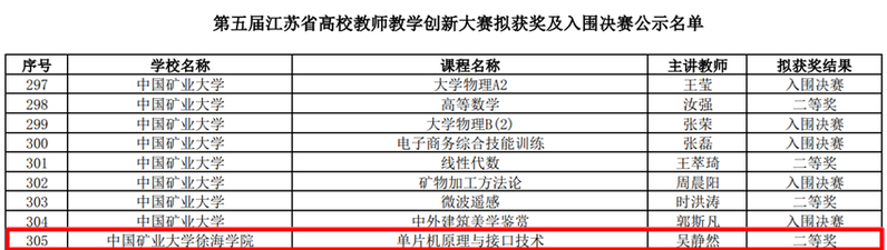 近日,第五届江苏省高校教师教学创新大赛网络评审结果公布,由信电系吴静然老师主讲的《单片机原理与接口技术》课程在大赛中表现优异,荣获二等奖。