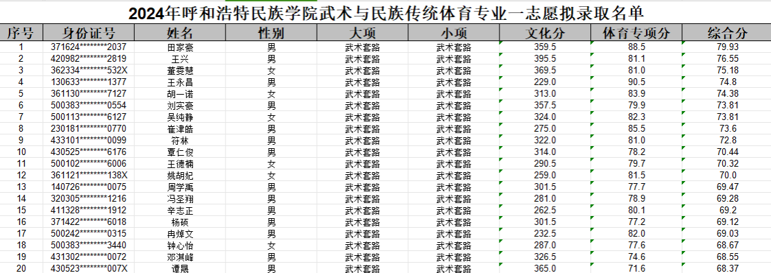 根据体育总局办公厅和教育部办公厅关于印发《2024年普通高等学校运动训练、武术与民族传统体育专业招生管理办法》的通知(体科字〔2023〕188号)要求,现将一志愿拟录取名单予以公示,公示期:2024年5月24日-31日,电话:0471-6585520。