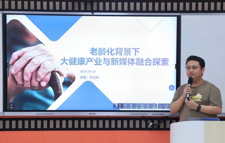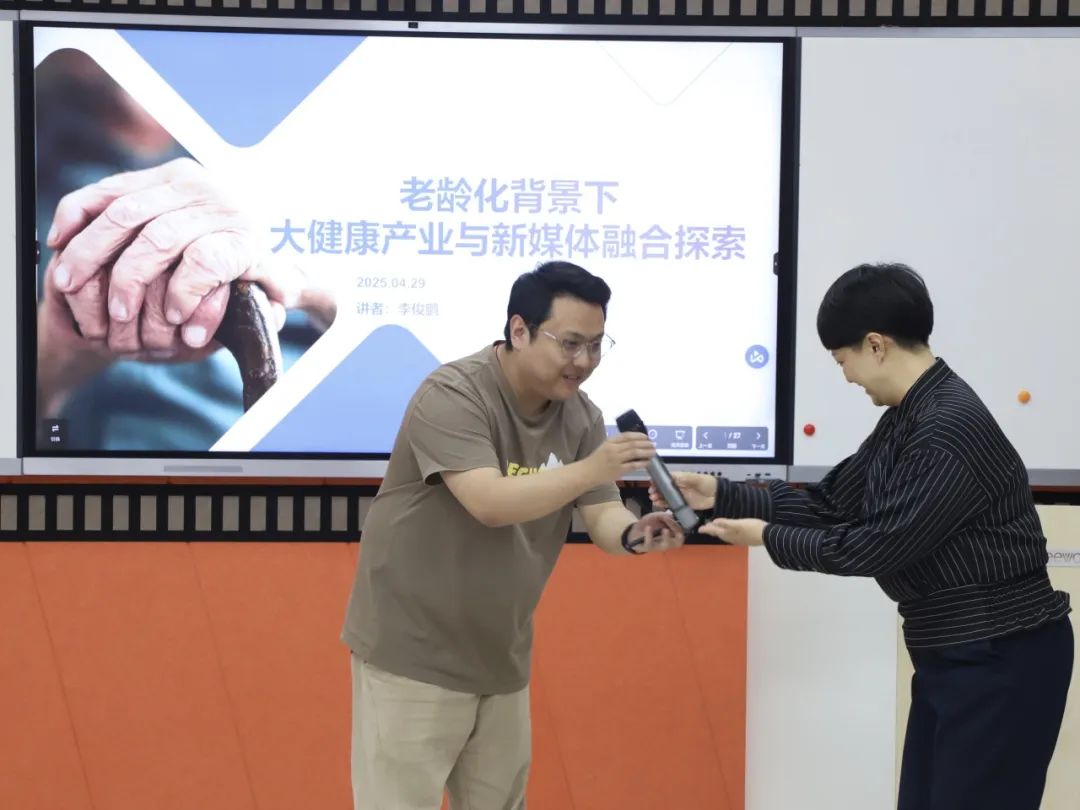 管理学院第七届创新人才培养班第九讲于2025月4月29日下午17:30在闻院122开展。本次课程由成都鹿鸣光年文化传媒有限公司负责人李俊鹏先生为大家讲述《我国老龄化背景下 大健康产业与新媒体融合探索》出席本次课程的还有管理学院副院长黄娟教授以及创新班班主任陆通源老师和华丽老师会展经济与管理专业教研室的何杨老师。
