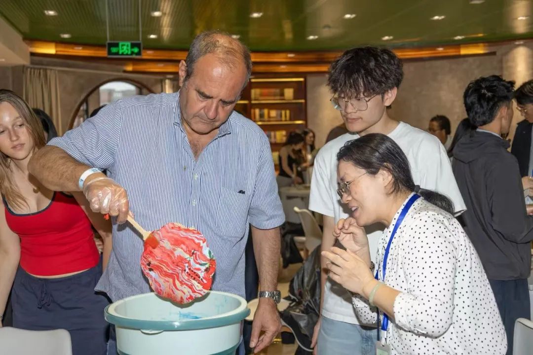 紧接着,他们去到图书馆5楼,体验漆扇制作并且与设计与美术学院的同学们交流探讨如何制作漆扇,通过这次活动不仅展现了同学们之间的友好相处,也体现漆扇背后的历史文化,更体现三千年漆艺底蕴和中国传统手工艺的独特魅力。