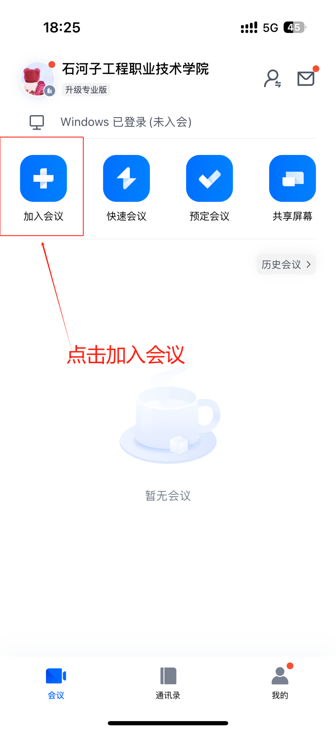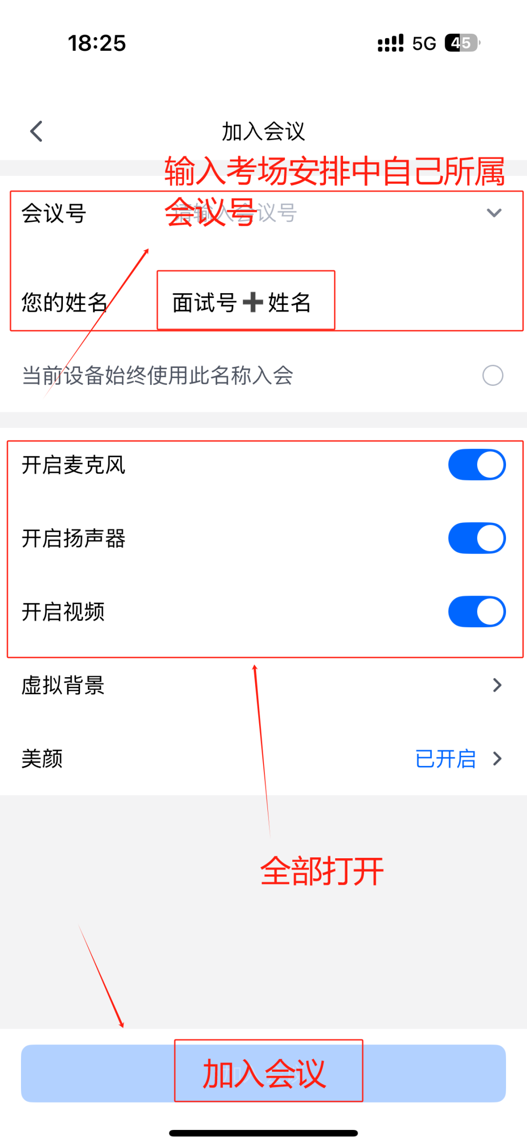 第三步:在“会议号”中输入考场安排中自己所属会议号。在“您的姓名”中输入面试号+姓名(身份证全称)。