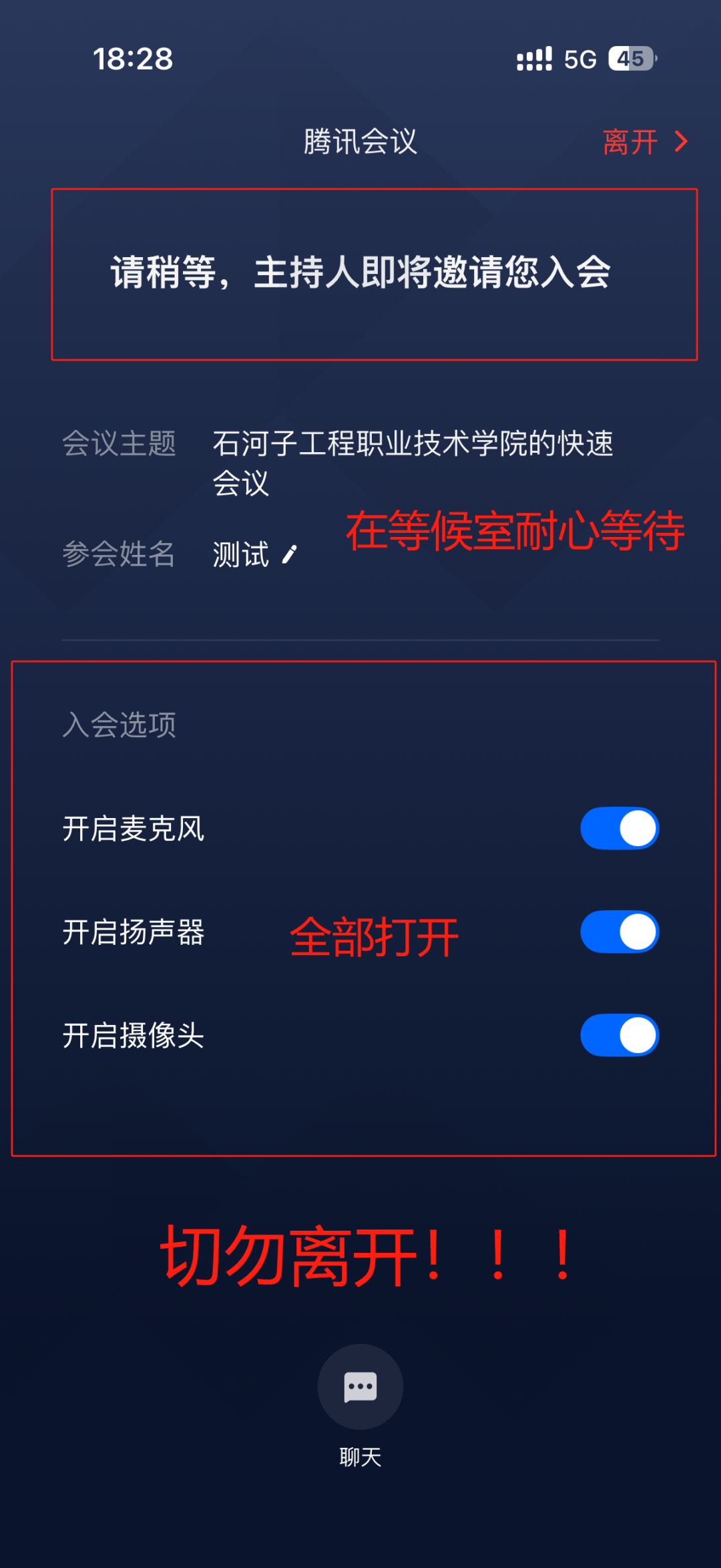 第四步:进入等候室耐心等待,并将麦克风、扬声器、摄像头全部开启。摄像头应固定于稳定位置,确保光线充足、影像清晰。不允许离开,否则会影响考试。