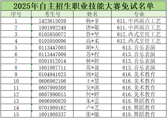 根据国家和省有关文件精神,在省级(含)以上行政部门主办的职业技能大赛获奖的学生可申请免试,按照《广东省外语艺术职业学院2025年高职自主招生章程》的规定,经考生个人申请,学校审查并相关专业所在二级学院组织复核,杨云菲等15名考生符合我校2025年高职自主招生职业技能大赛获奖免试录取报名资格,现予公示。