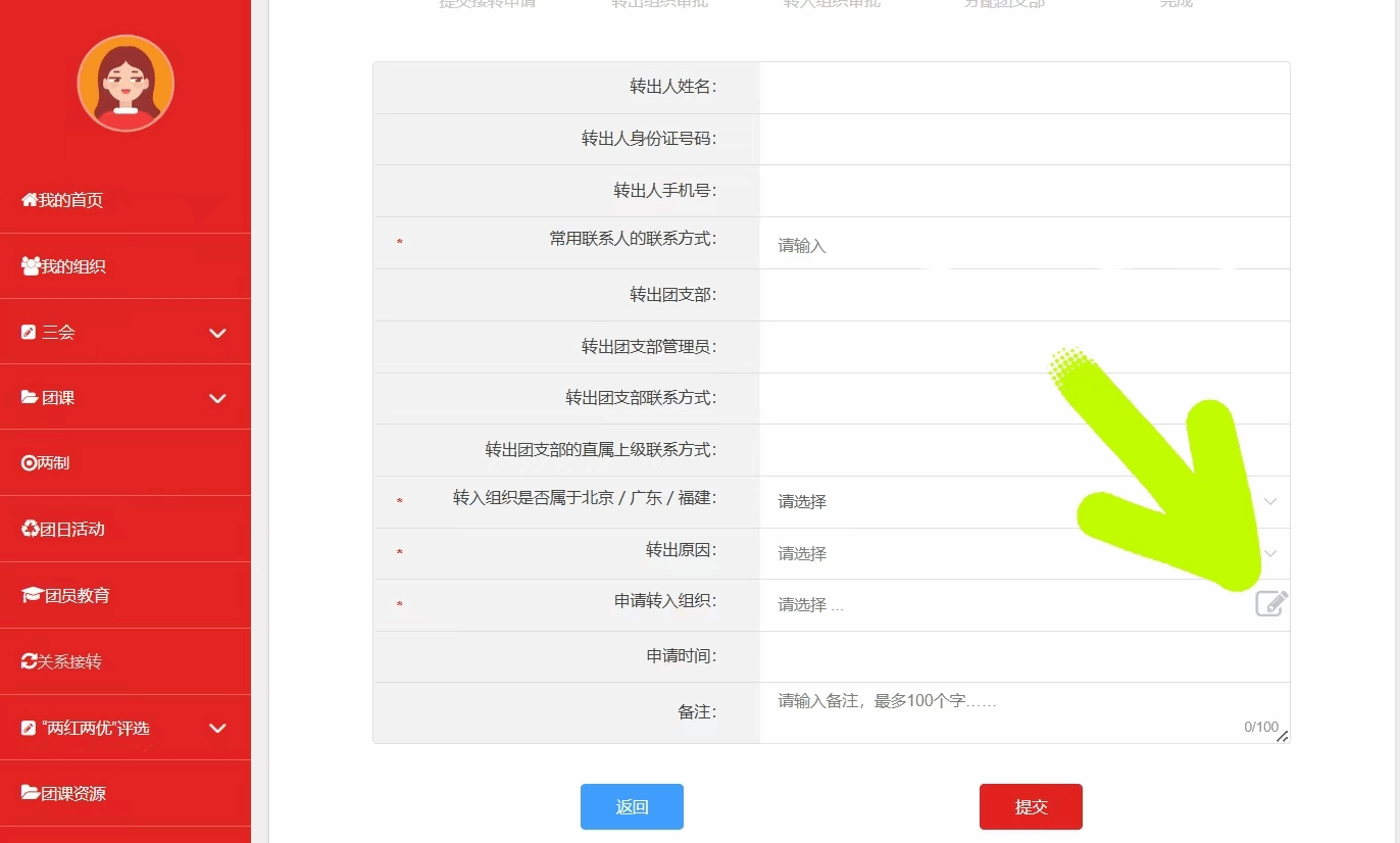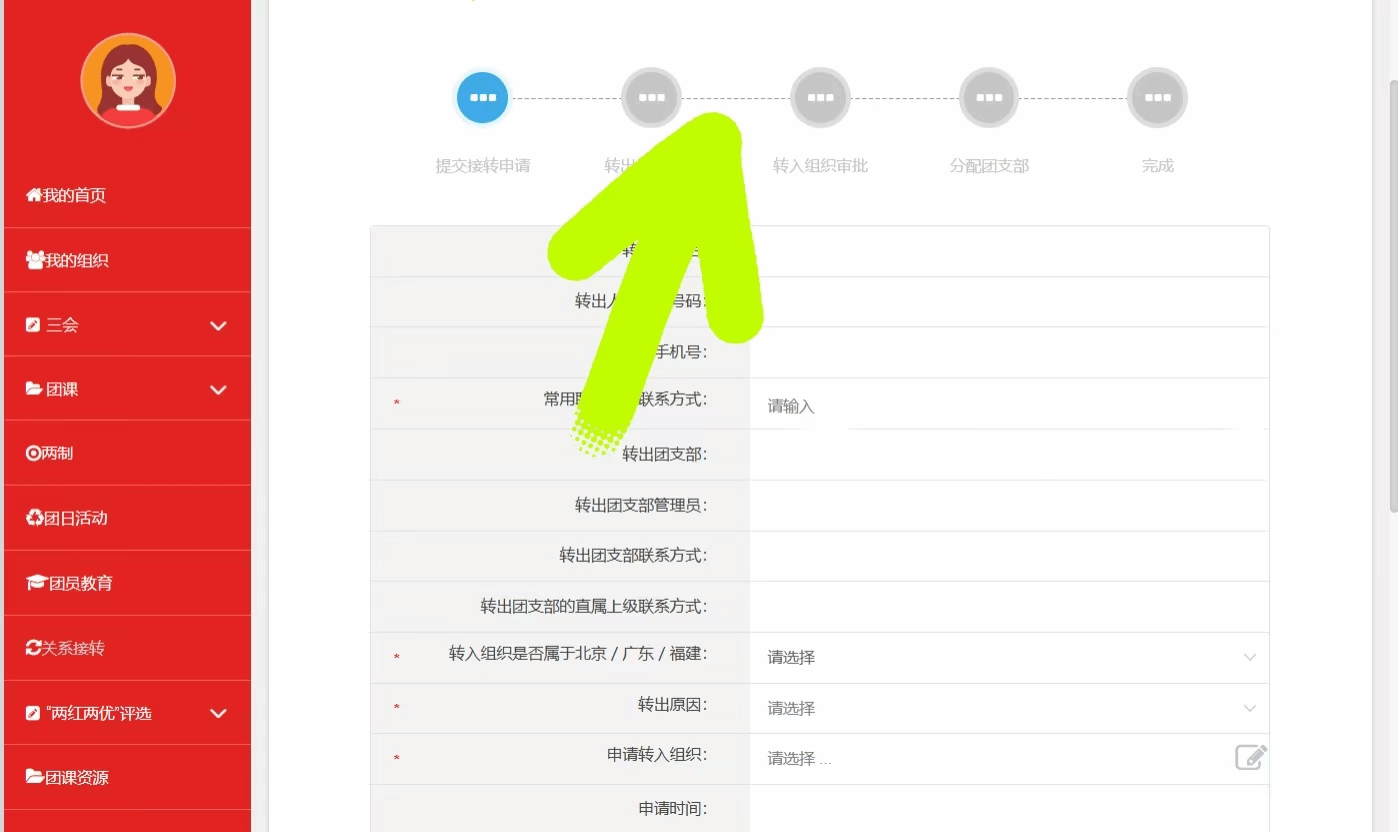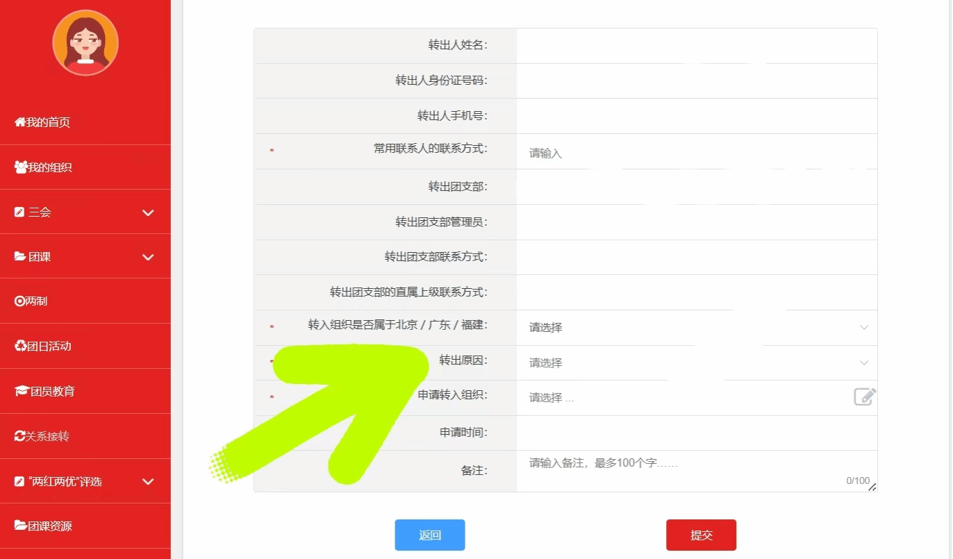 【注】①转入组织若为北京/广东/福建,须明确转入团组织在北京/广东/福建系统内的组织全称,并在发起业务界面准确无误地填写转入团组织名称。②转出原因:升学。