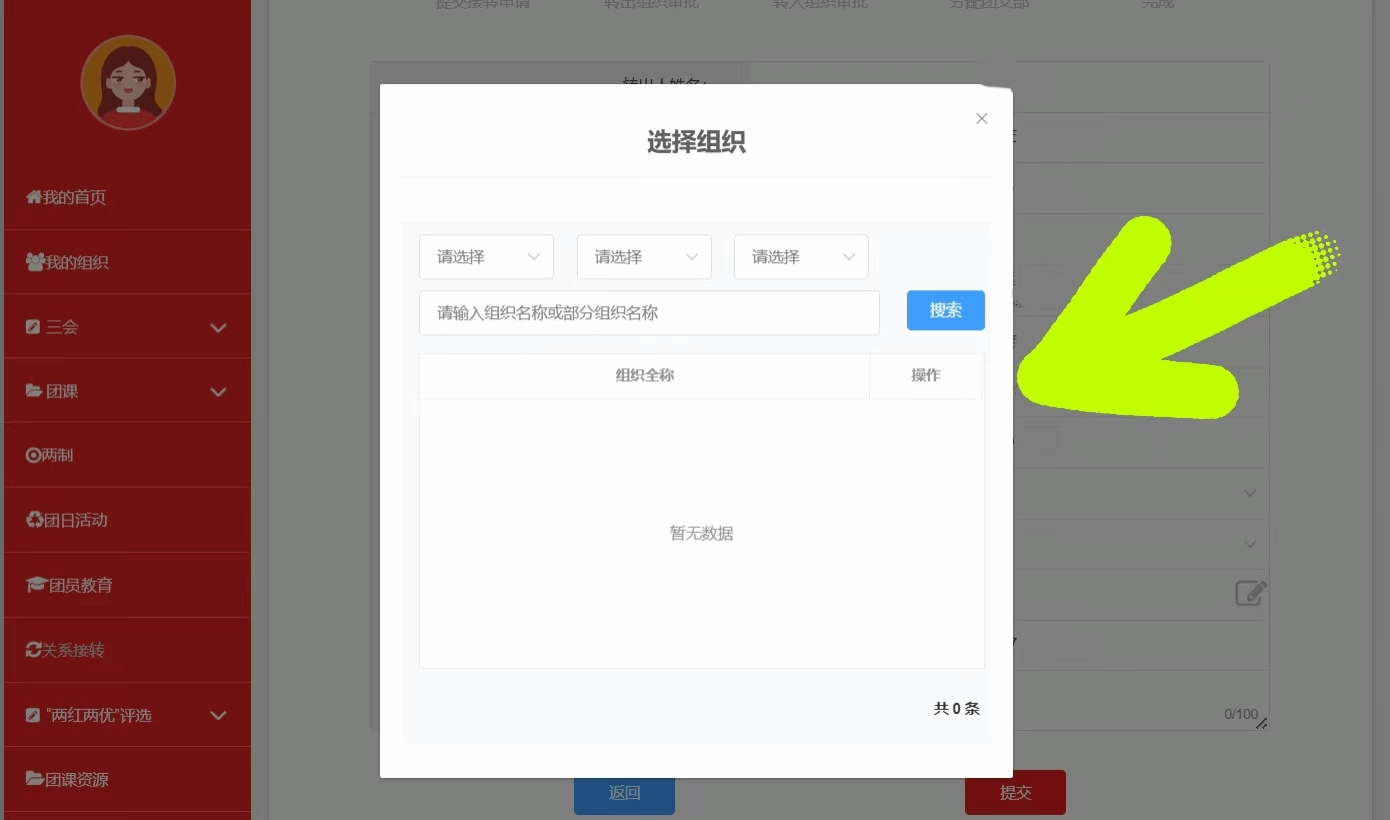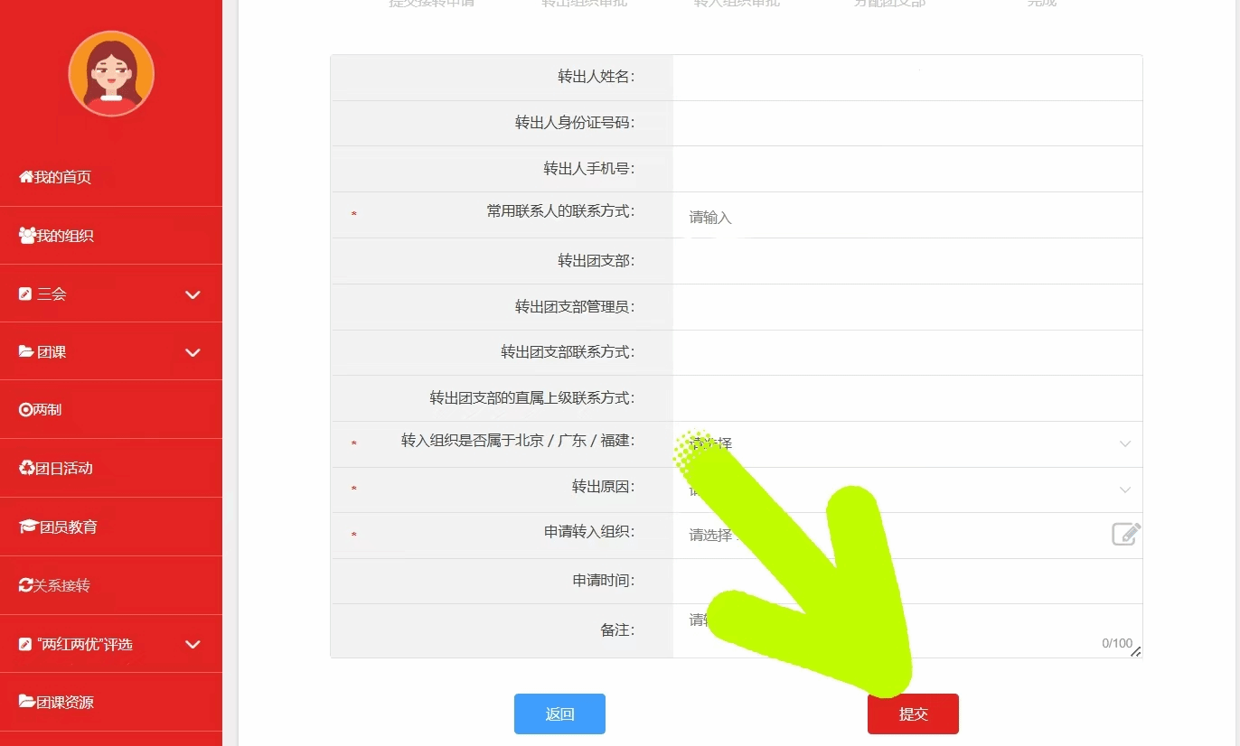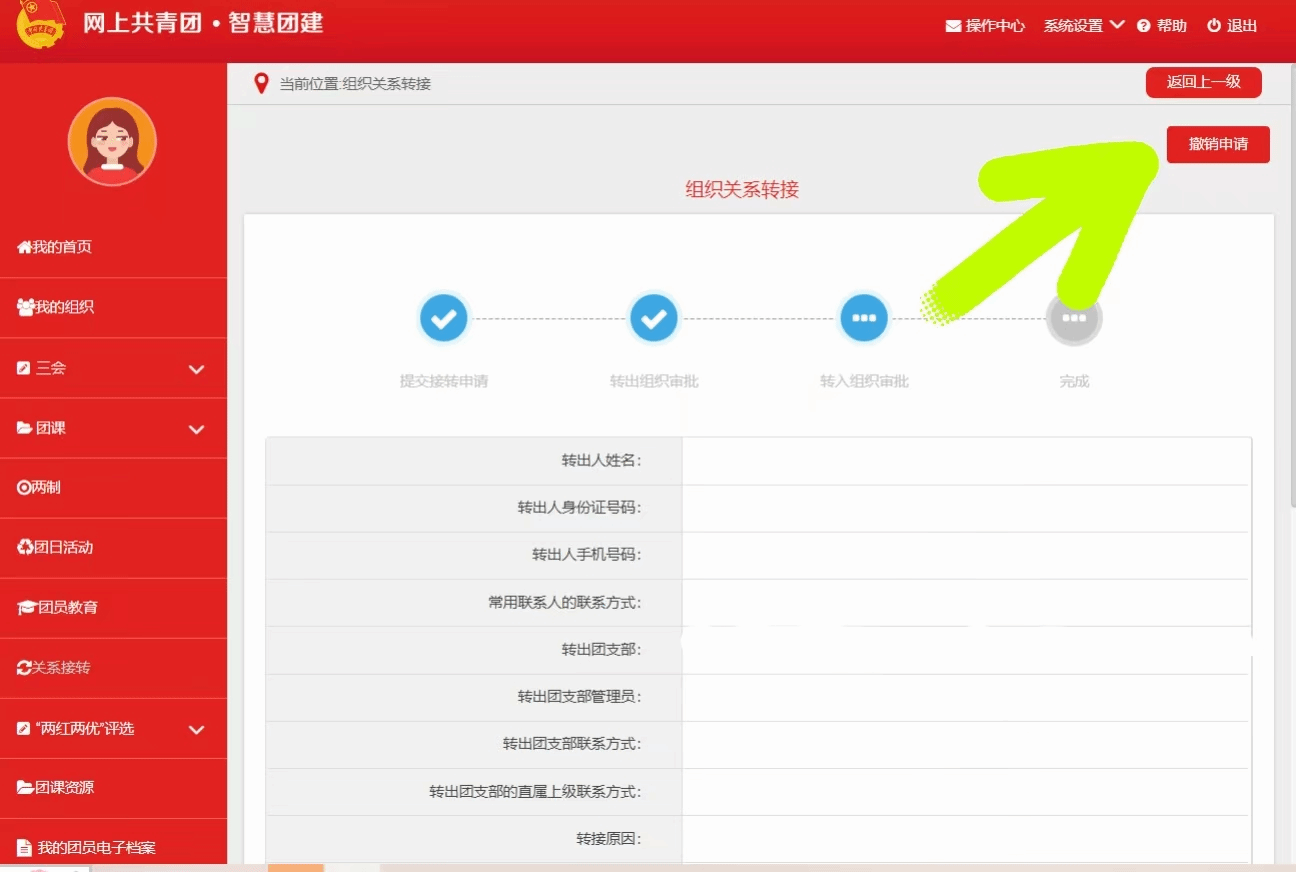 【注】①转入组织若为北京/广东/福建,须明确转入团组织在北京/广东/福建系统内的组织全称,并在发起业务界面准确无误地填写转入团组织名称。②转出原因:升学。