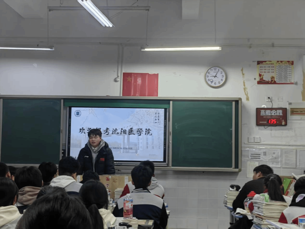 宣讲过程:为增进母校学弟学妹对沈阳医学院的了解,作为沈阳医学院大一学生,于2025年寒假返回母校遵义市第二十二中学开展宣讲活动。通过视频展示沈医校园风貌,介绍学校特色专业及就业前景,结合自身经历分享医学专业学习体验和校园文化活动;解读近年招生政策,分析贵州省录取分数线及位次要求;还设置自由提问环节,解答关于医学专业学习、志愿填报技巧等问题。
