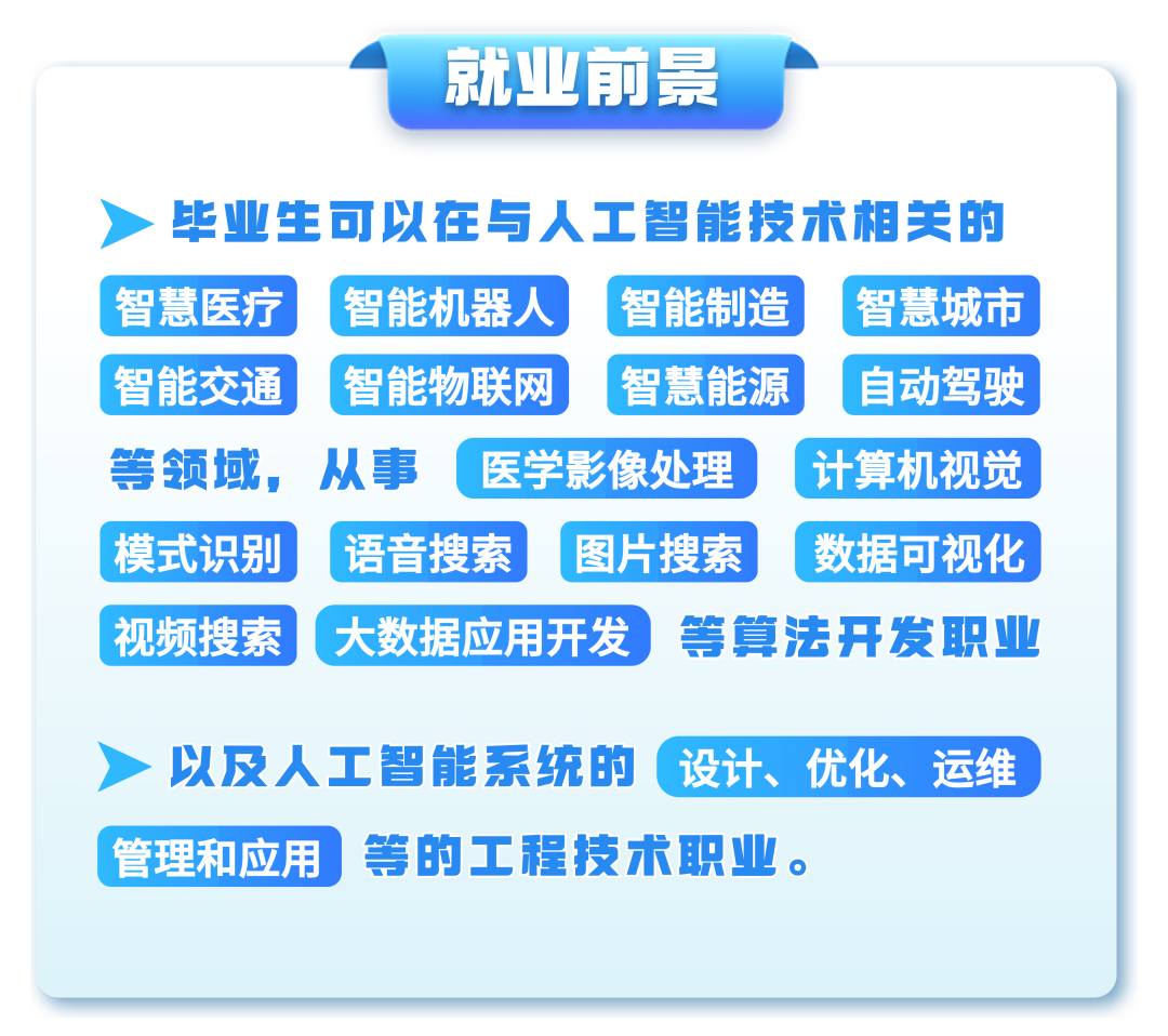 专业立足于北京《“十四五”时期高精尖产业发展规划》中明确指出的加快建设国家人工智能创新应用先导区为重点,构筑全球人工智能创新策源地和产业发展高地,建设国家人工智能赋能中心,推动应用牵引创新的人才需求,面向国家人工智能发展战略,以社会和行业需求为导向,通过“产学研用”一体化的人才供给模式,努力成为北京市人工智能工程师的培养摇篮。