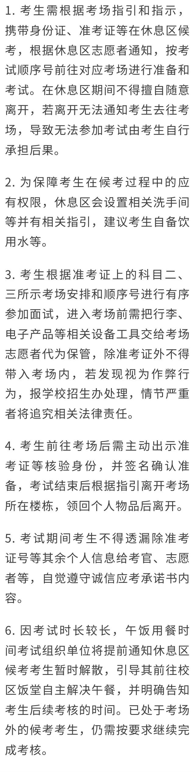 考生需在规定时间前5分钟到达30栋门口查验准考证、身份证,并签到确认后到候考室等候,根据准考证号上顺序参加科目一、科目二面试。