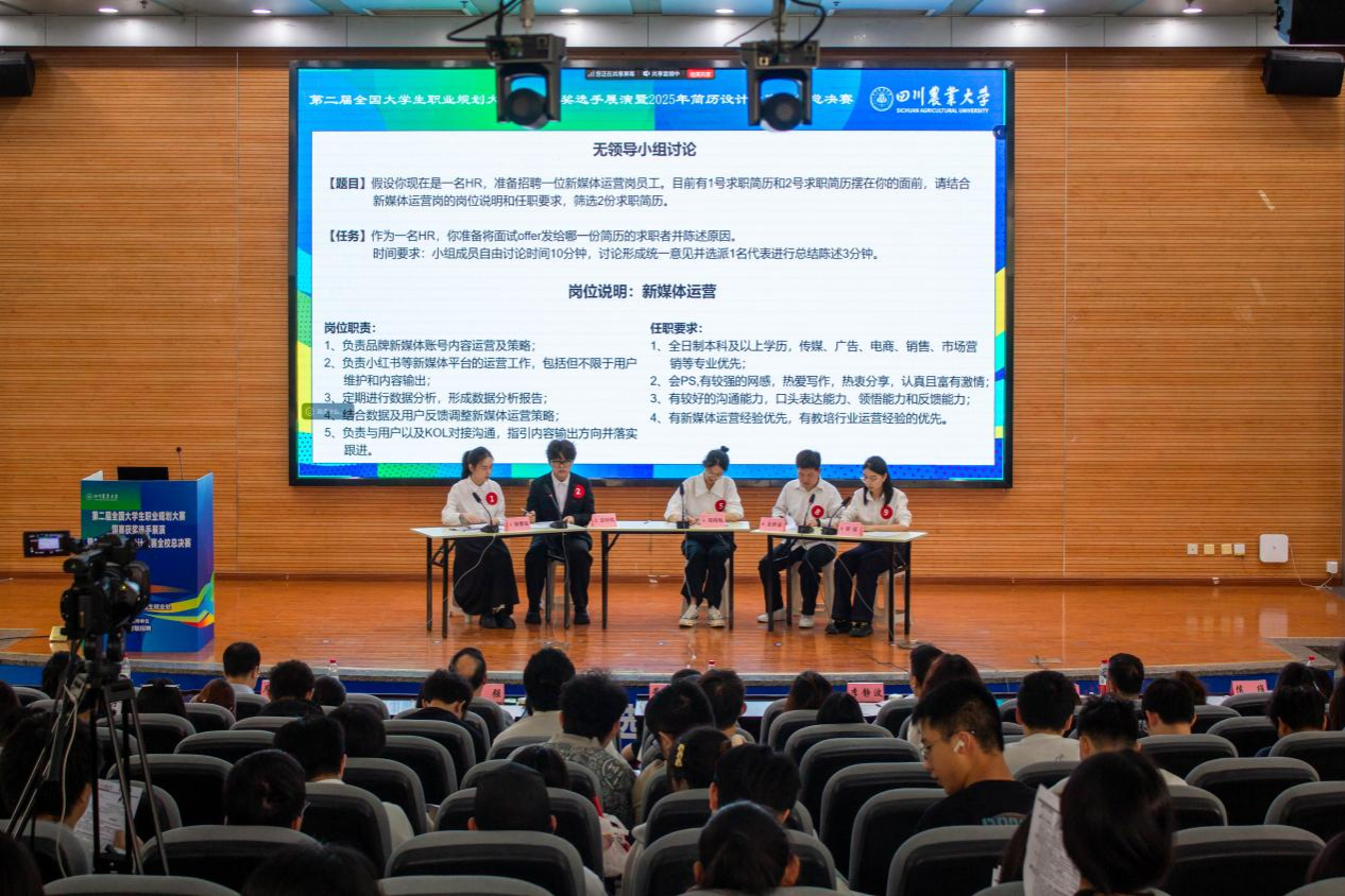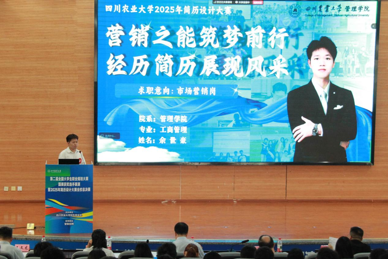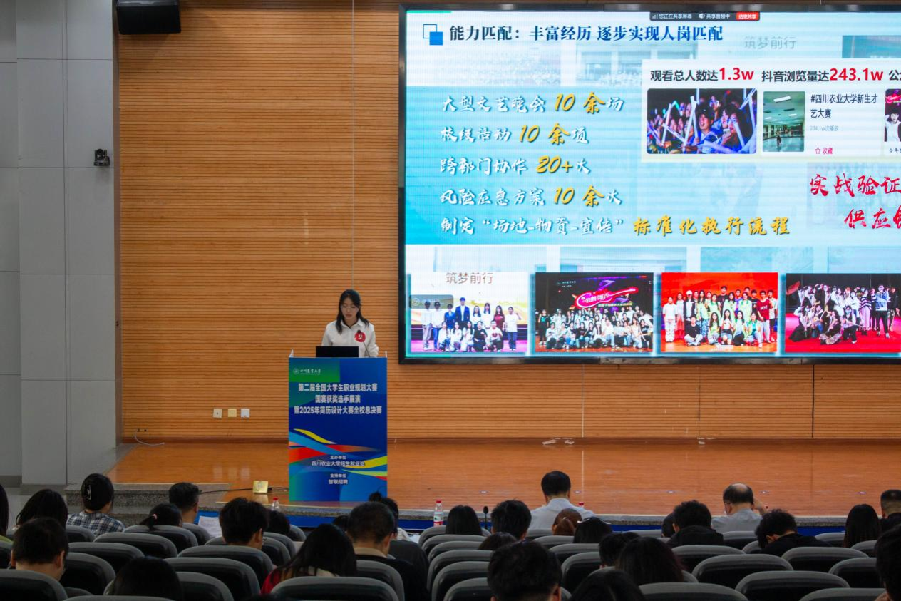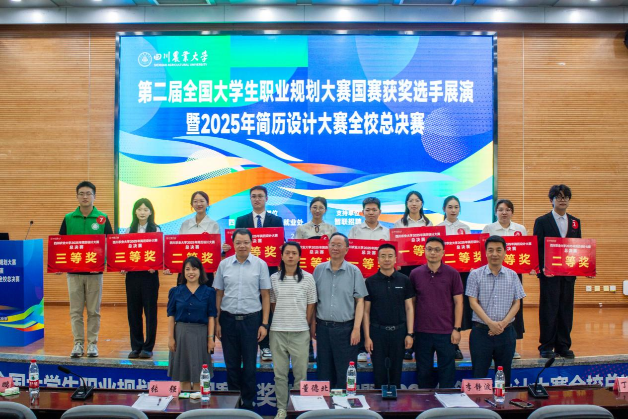 5月14日下午,我校第二届全国大学生职业规划大赛国赛获奖选手展演暨2025年简历设计大赛全校总决赛在成都校区二教报告厅精彩落幕。学校党委副书记张强,智联招聘校园及国际事业部-交付中心西区总监董德北,新东方教育科技集团成都学校人力资源部高级经理苏宇杰,实习僧联合创始人、有见求职合伙人丁伟,招生就业处、学工部、校团委等相关职能部门负责人参加并担任评委,300余名师生现场观摩,1000余名师生通过“微观川农”在线观看。
