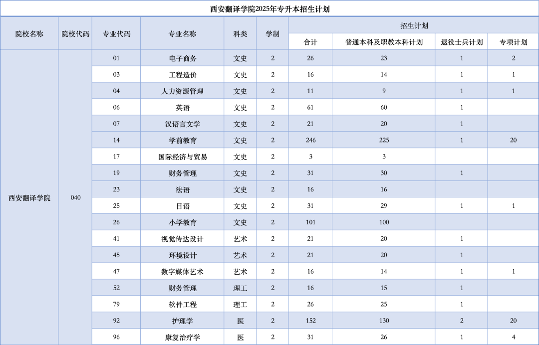 西安翻译学院2025年专升本专业招生计划