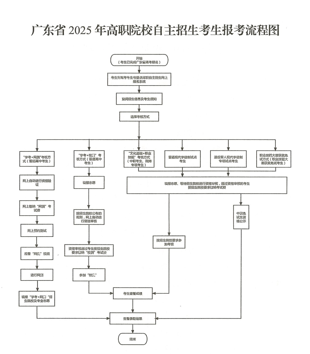 因未认真查阅院校专业报考要求而在填报志愿后无法获得报考资格的责任由考生自负。考生一经院校确认报考资格后不得更改所填报的考核类型及院校、专业志愿,缴纳的考试费概不退费。报考流程见图1。(二)高校在校生、2025年被依据普通高中学业水平考试成绩招生录取、普通高等学校招收中等职业学校毕业生统一考试招生录取的考生,以及中高职贯通三二分段转段录取的考生不得参加高职院校自主招生录取。
