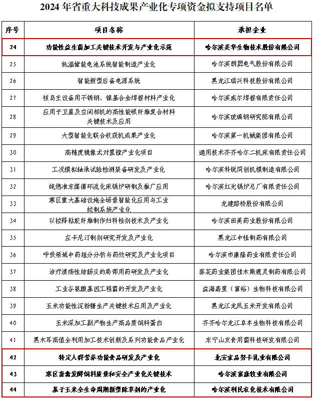 近日,黑龙江省科学技术厅发布了关于2024年黑龙江省重大科技成果产业化专项资金拟支持项目名单的公示,全省拟支持项目44个,其中,学校食品学院李柏良教授与哈尔滨美华生物技术股份有限公司联合申报的“功能性益生菌加工关键技术开发与产业化示范”,张微副研究员与北安宜品努卡乳业有限公司联合申报的“特定人群营养功能食品研发及产业化”,动物科学技术学院石宝明教授与哈尔滨富康牧业有限公司联合申报的“寒区畜禽发酵饲料质量和安全产业化关键技术”,文理学院付颖教授与哈尔滨利民农化技术有限公司联合申报的“基于玉米全生命周期新型除草剂的产业化”4个项目获专项资金支持,资金由“省拨资金”和“市地配套”两部分构成,支持额度合计2800万元。获批项数和支持额度均创历史新高。