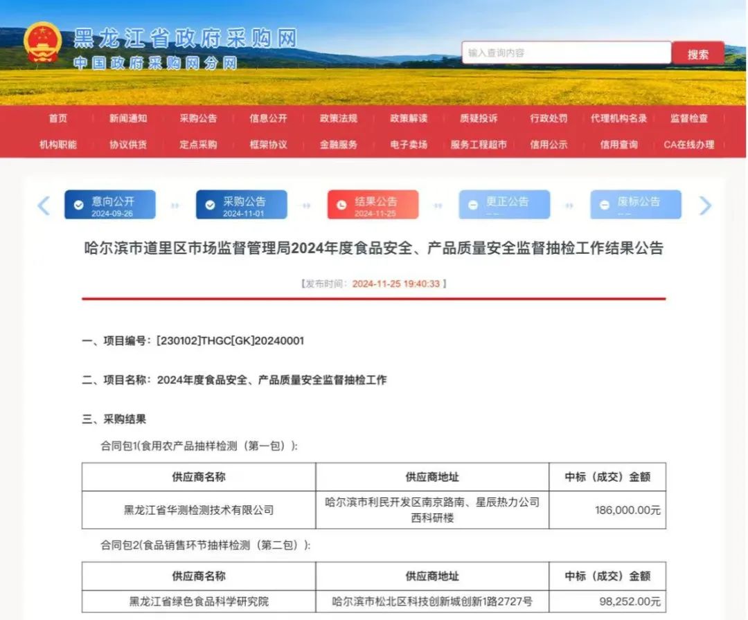11月25日,黑龙江省政府采购网发布了“哈尔滨市道里区市场监督管理局2024年度食品安全、产品质量安全监督抽检工作结果公告”,黑龙江省绿色食品科学研究院参与投标项目再次成功中标。