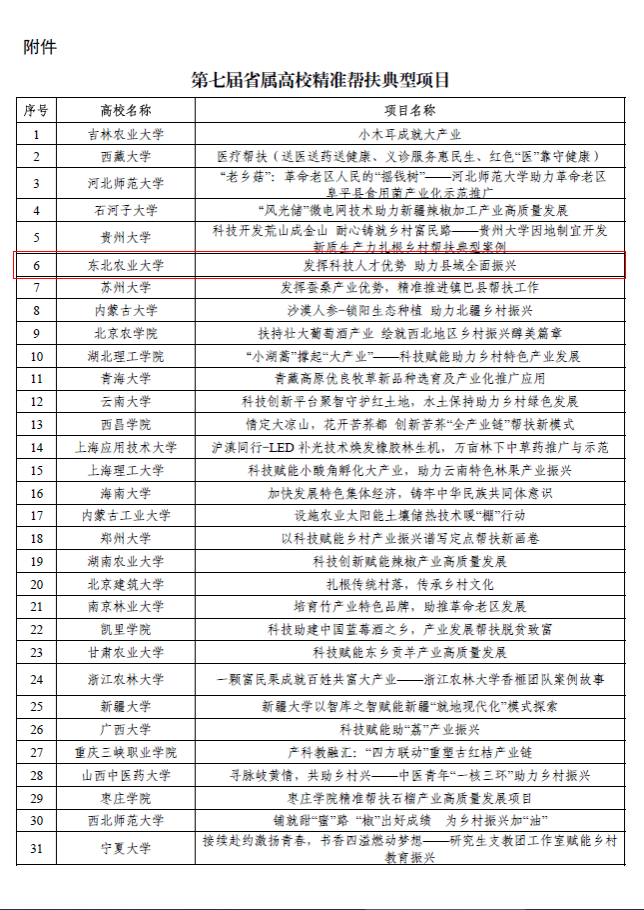 11月18日,教育部公布了第七届省属高校精准帮扶典型项目的推选结果,东北农业大学申报的《发挥科技人才优势、助力县域全面振兴》项目成功入选。