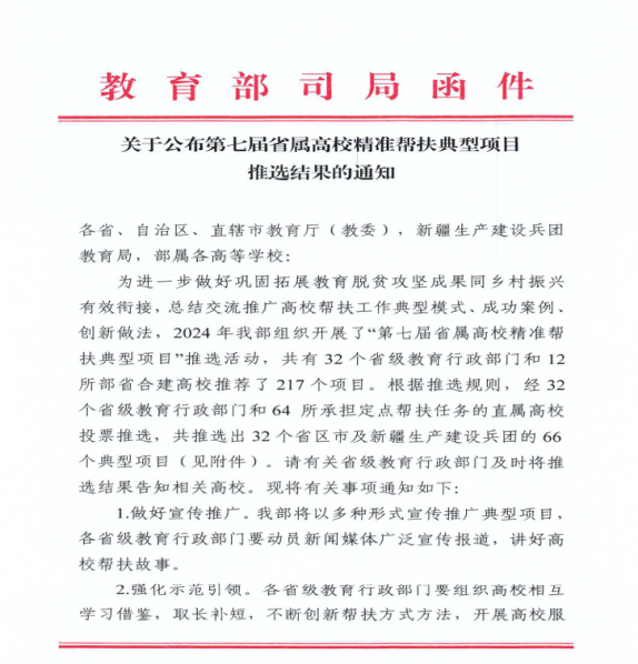 第七届省属高校精准帮扶典型项目推选活动由教育部发展规划司具体实施,为进一步做好巩固拓展教育脱贫攻坚成果同乡村振兴有效衔接,总结交流推广高校帮扶工作典型模式、成功案例、创新做法,经32个省级教育行政部门和64所承担定点帮扶任务的直属高校投票推选,共评选出66个精准帮扶典型项目。