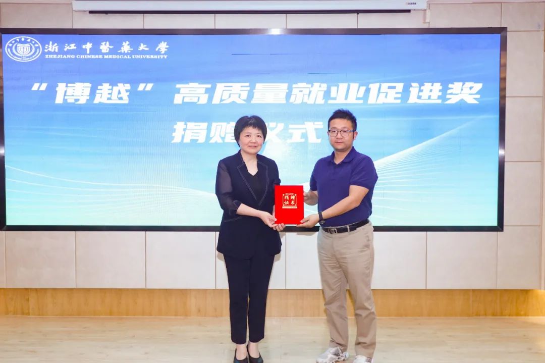 会上,还进行了“博越”高质量就业促进奖捐赠仪式。黄爱军为捐赠单位颁发捐赠证书,学生工作部(学生处)负责人代表学校接受浙江博越教育科技有限公司总经理丁忠明代表公司向学校的捐赠。