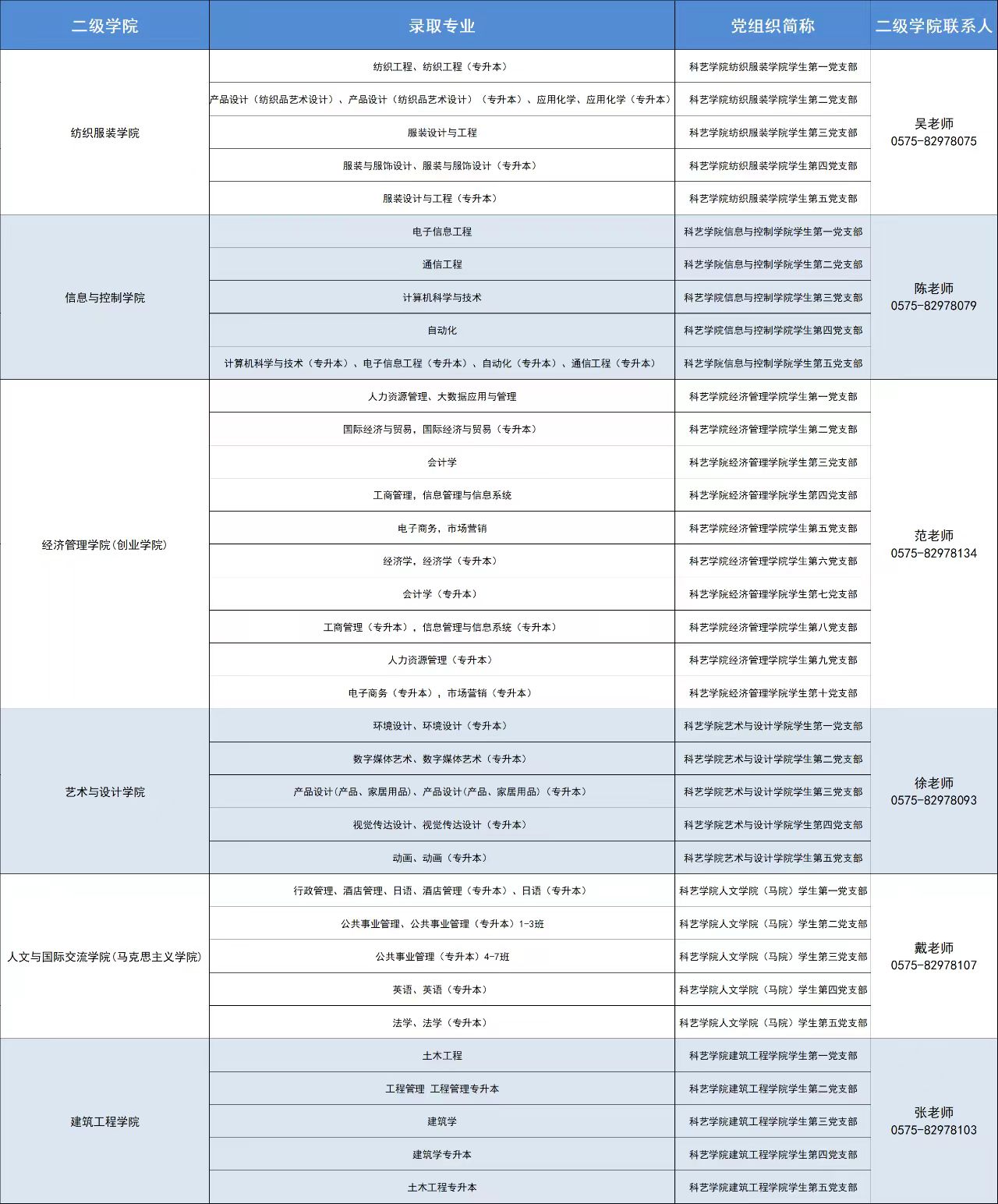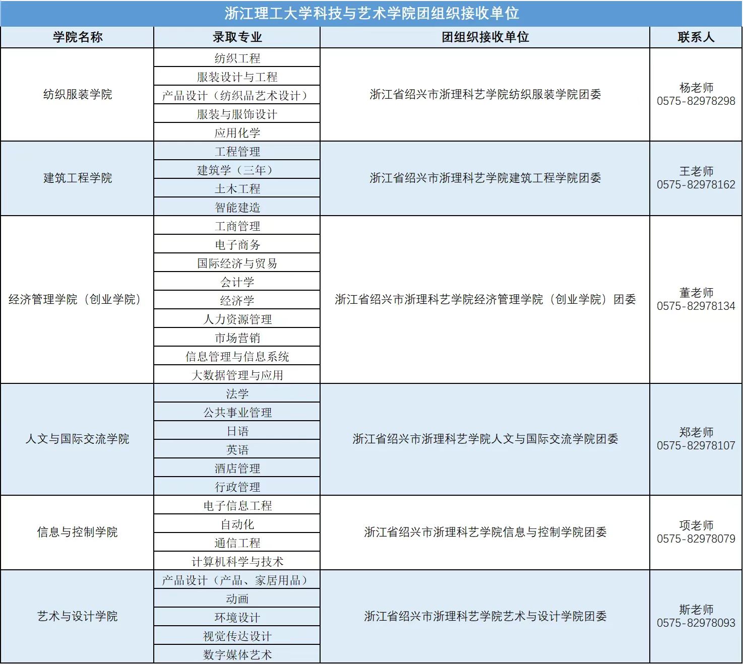 2.新生团员需进行团组织关系转入:(1)由毕业院校办理网上转接,在“智慧团建”系统(网址:https://zhtj.youth.cn/zhtj)完成线上转;(2)持毕业院校办妥转接手续的团员证、入团志愿书、入团申请书、团组织关系介绍信。团组织关系介绍信抬头为根据拟录取专业,填写目标团组织,具体如下:。(预计开学报道后两周开始接收团组织关系,团委咨询电话0575-82978057。)