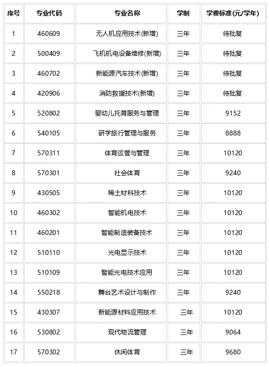 第一章总则第一条 为规范招生工作,维护广大考生的合法权益,保证招生工作的顺利进行,根据《中华人民共和国教育法》、《中华人民共和国高等教育法》及教育部普通高等学校招生工作的有关规定,并结合我院招生工作的具体情况,特制定本章程。第二条 本章程适用于和君职业学院2025年专科层次的招生工作。第三条 依照教育部普通高等学校招生工作规定,学校招生工作遵循“公平竞争、公正选拔、公开程序,德智体美劳全面考核、综合评价、择优录取”的原则。第二章学校概况第四条 学校全称:和君职业学院第五条 国标代码:4136014748第六条 办学层次及类型:民办非营利性全日制普通高职院校第七条 办学定位:和君职业学院,定位为“精品职业院校”,秉持“少而精、新而专”的专业设置理念,2025年开设十七个专业:无人机应用技术、飞机机电设备维修、消防救援技术、新能源汽车技术、婴幼儿托育服务与管理、研学旅行管理与服务、体育运营与管理、稀土材料技术、智能机电技术、智能制造装备技术、智能光电技术应用、光电显示技术、舞台艺术设计与制作、社会体育、新能源材料应用技术、现代物流管理、休闲体育。第八条 办学地点:江西省赣州市会昌县白鹅乡和君教育小镇。第三章组织机构第九条 学校设有招生工作顾问委员会、招生工作领导小组、招生工作监督委员会,主要负责审议学校招生政策,对招生工作提供咨询意见,并对招生工作全程监督检查。第十条 学校设有招生管理工作委员会,全面负责学校普通类招生工作;学校招生办公室是学校组织和实施普通类招生工作的常设机构,其主要职责是:(一)执行国家、教育部有关招生法规、政策以及各生源省级招生主管部门有关招生政策。执行学校招生章程及学校招生工作委员会的决定。(二)根据学校年度招生计划,科学、合理地编制和实施各生源省份专业招生计划。(三)组织开展学校招生宣传工作,与各职能部门、系部共同做好招生信息服务及咨询工作。(四)负责学校录取各类考生,并负责处理录取中的各种问题。(五)根据国家有关规定对录取新生进行入学资格复查。第十一条 为加强对招生工作人员的纪律教育和责任约束,学校纪检监察室负责监督招生工作各项政策和规定的落实,切实维护广大考生和学校的合法权益。第四章招生计划第十二条 根据教育部有关工作要求,学校综合考虑各省(市、区)考生人数、生源质量、毕业生就业情况等因素,并结合同类学校历年招生实际情况,确定各生源省份专业计划。经教育部审核后由各生源省级招生主管部门向社会公布。第十三条 我院2025年招生类别为普通类,招生批次以各生源省级招生主管部门公布为准。第十四条 学校实行专业招生计划动态平衡机制。对于社会需求量大且生源好的专业,可适当增加招生计划;对基础学科或就业形势好但报考人数少的专业,可采取一定措施予以扶持;对个别社会需求量小、学生报考少的专业,学校可调整其招生计划,对其采取减招、隔年招生或停招的办法。第五章招生专业及收费标准第十五条 我院2025年招生专业及收费:现有招生专业继续执行2024年学费标准(具体标准详见下图),2025年新设专业收费标准以江西省教育厅、江西省发改委、江西省市场监管局完成备案审批后公布,住宿费为1000-2600元/人/学年(六人间),所有收费标准均严格依照江西省教育厅、财政厅、物价局有关文件规定执行。退学:依据《中华人民共和国民办教育促进法》、《中华人民共和国民办教育促进法实施条例》和《关于印发<民办教育收费管理暂行办法>的通知》(发改价格[2005]309号)的规定,按照《江西省民办高校学生退学退费办法》(赣教字【2007】8号)执行相关退学退费政策。