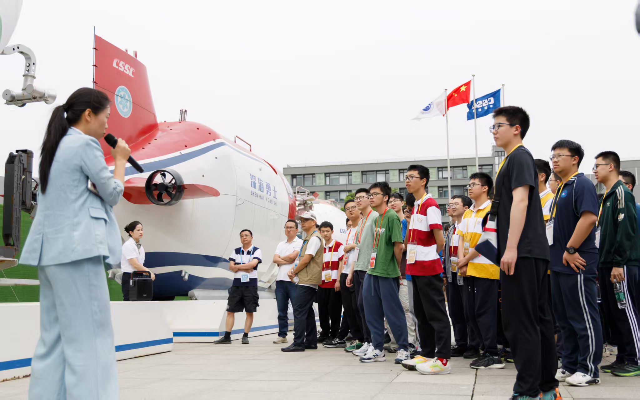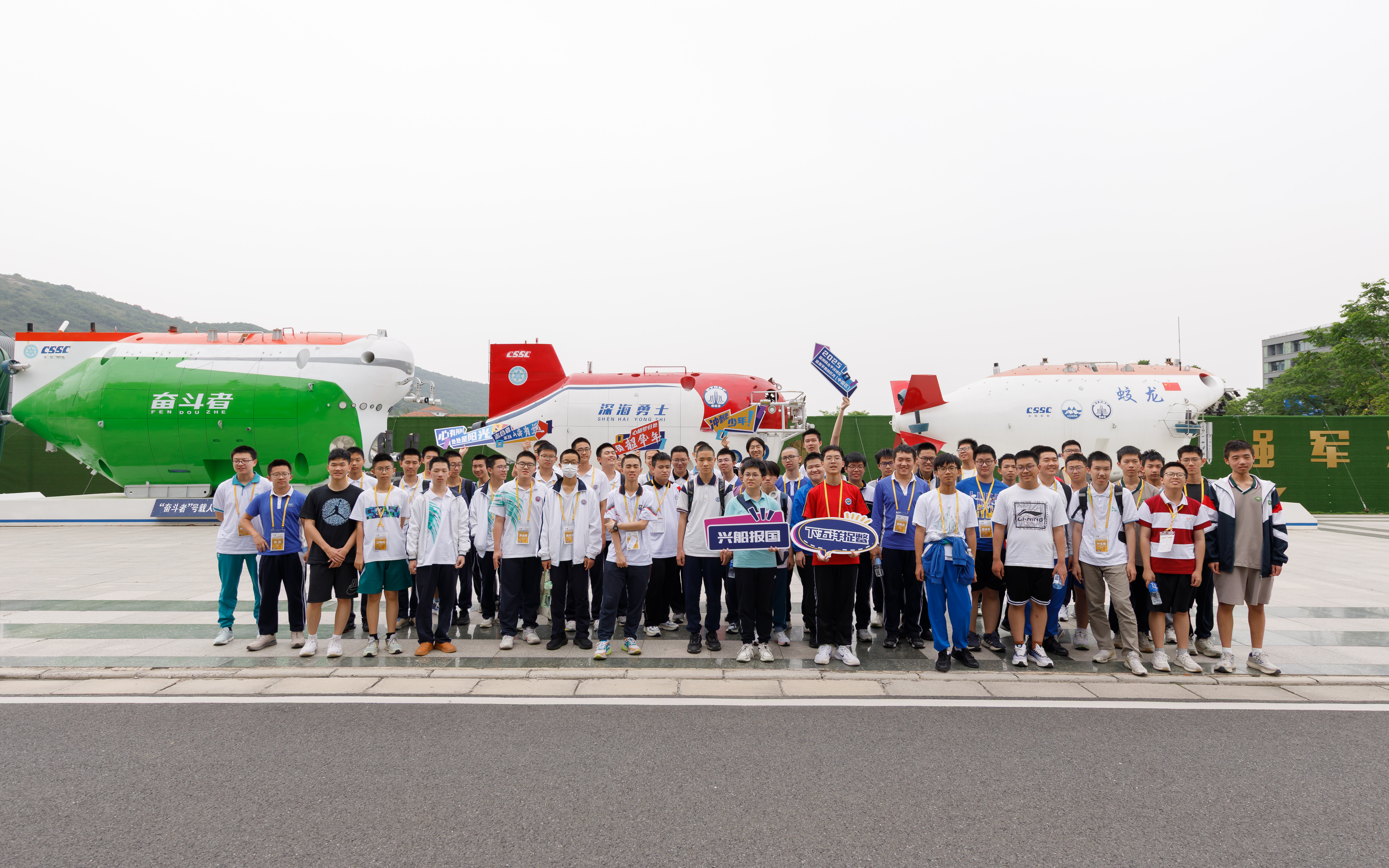 为了让选手们在紧张的测试比拼之余,能更深入地感受科技的魅力与力量,本次活动特别策划了别具意义的社会实践。通过组织选手及教师走进中国船舶科学研究中心,开启了一场难忘的科技探索之旅。近距离观摩“蛟龙号”、“深海勇士号”、“奋斗者号”等大国重器的全尺寸模型、聆听专业讲解了解我国在万米深潜技术上的重大突破、观看相关介绍视频进行互动式学习,使选手和教师们直观感受到我国深海探测的全球领先地位,并进一步加深理解科技如何服务民生与国家战略。本次社会实践不仅是科普之旅,更是一堂生动的爱国主义教育与跨学科创新课,激发着选手们在跨学科领域勇于创新、敢于探索的热情。