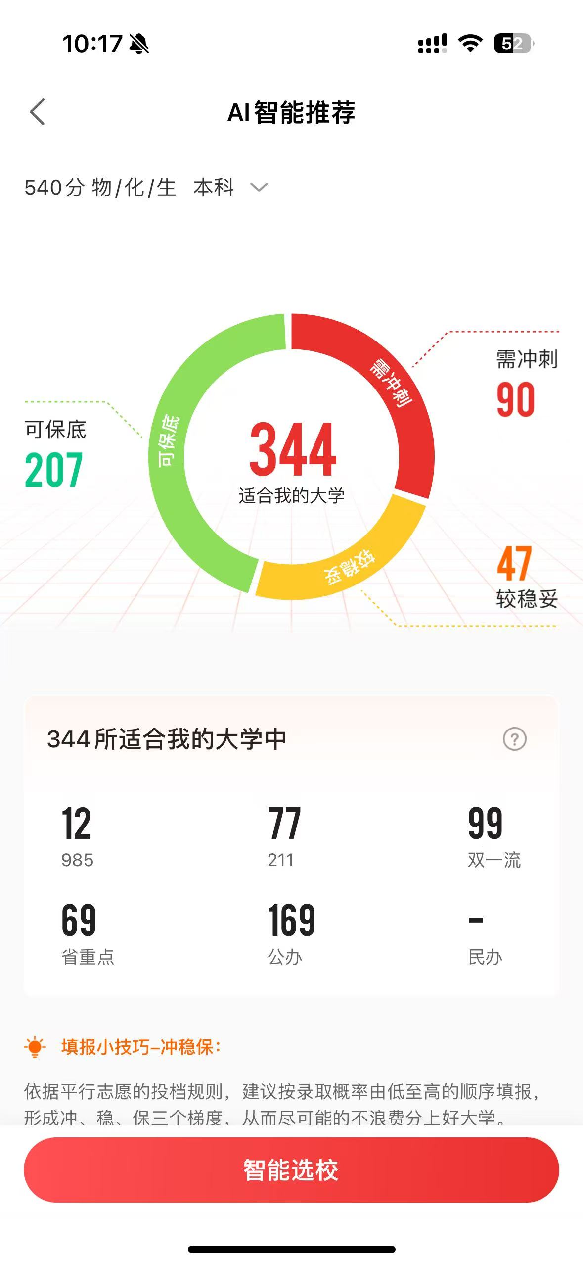 除了家长心态转变外,家长还需帮助提前规划高考后的志愿填报。志愿填报是高考的 “下半场”,科学规划不仅能让孩子的分数发挥最大价值,更关乎未来的职业发展和人生走向。如果屏幕前的您还不知道,怎样帮孩子做志愿填报,可使用优志愿【智能填报】功能,帮你精准匹配适合的院校及专业。您只需输入分数和位次,系统会快速生成个性化志愿填报方案,涵盖冲刺、稳妥、保底多个梯度的院校推荐。同时,优志愿【智能填报】还会提供相应的录取概率分析,用直观