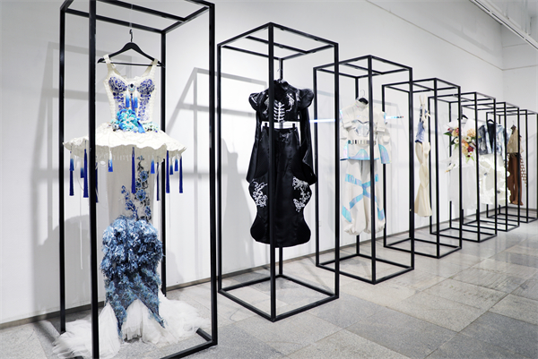 时装《风映青瓦》将瓷器纹样与针织面料相融合,赋予现代服饰东方时尚活力与灵动感。学院供图