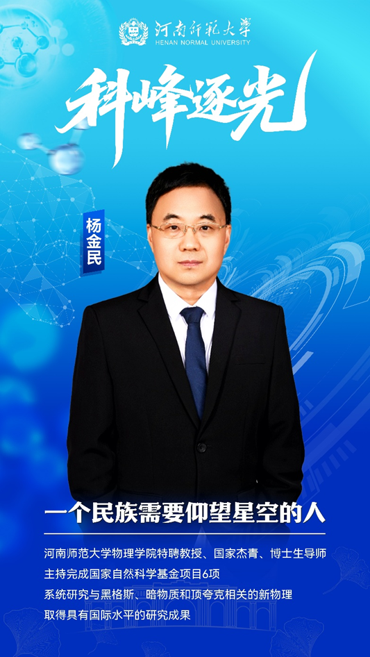 杨金民,河南师范大学物理学院特聘教授、国家杰青、博士生导师。先后主持完成国家自然科学基金项目6项(包括国家杰出青年科学基金项目和国家自然科学基金重点项目)以及省部级项目3项(包括河南省首届杰出青年科学基金项目、中国科学院百人计划项目、中国科学院前沿科学重点项目),发表论文200余篇,被引用9900余次。系统研究了与黑格斯、暗物质和顶夸克相关的新物理,取得了具有国际水平的研究成果。